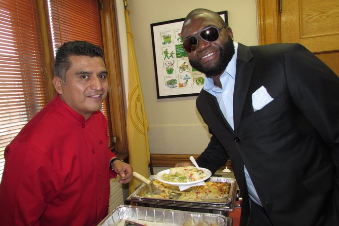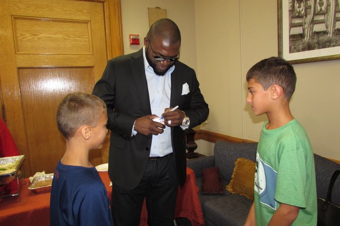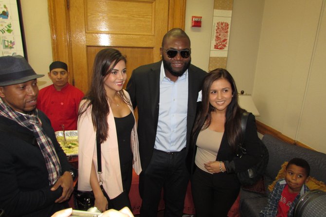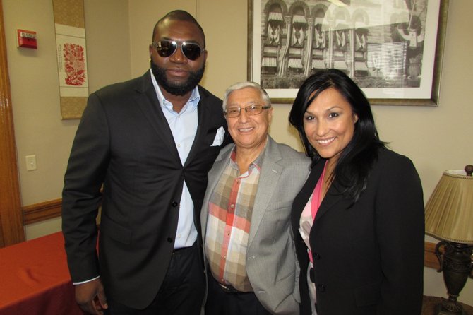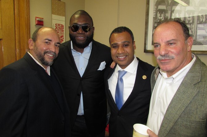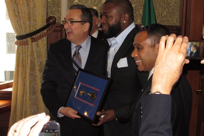 El alcalde de Cambridge David P. Maher y el concejal Dennis Benzan entregaron a Big Papi “La llave de Cambridge” (The Key of Cambridge) en un desayuno especial a cargo de Angela’s Café y en el marco del Mes de la Herencia Hispana.