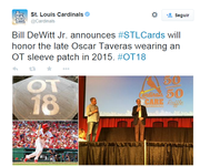 Los Cardenales de San Luis anunciaron el domingo que el equipo usará parches en sus camisolas en 2015, en honor al dominicano Óscar Taveras.