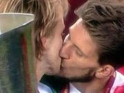 Uno de los más recientes ocurrió en la Europa League de 2014, cuando la euforia se apoderó de los jugadores del Sevilla Iván Rakitic y Felipe Martins Carriço y celebraron con un beso