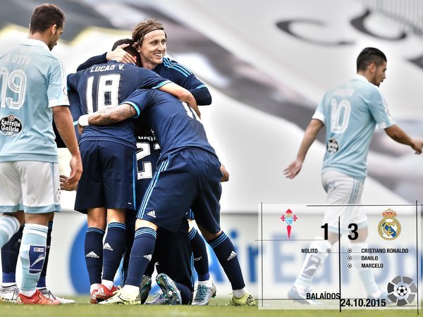 El Real Madrid se situó 2-0 con sus dos únicos tiros entre los tres palos de la primera parte, en el 8m marcó Ronaldo y en el 23m lo hizo Danilo. Nolito acortó diferencias en el 85m y Marcelo hizo el tercero en la prolongación (90+6m).
