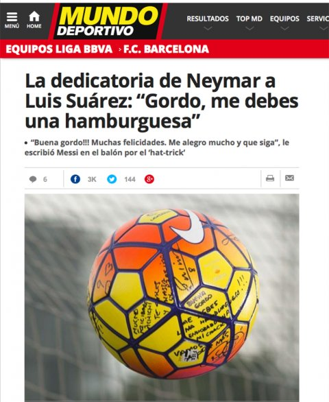 El diario Mundo Deportivo mostró la pelota de Suárez y la firma de Neymar