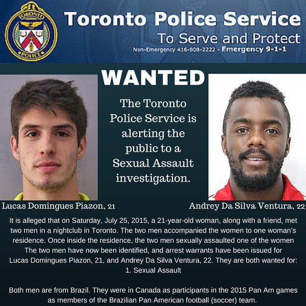 Según informes de la policía de Canadá, Piazón y otro elemento de la selección brasileña que participó en la pasada edición de los Juegos Panamericanos llamado Andrey da Silva, han sido inculpados de violación.