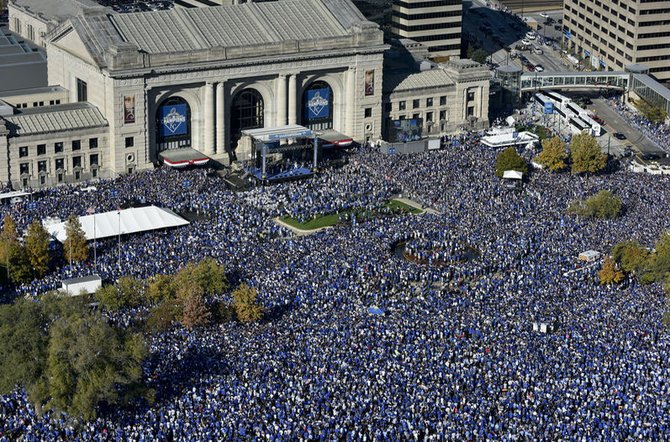 Tras un recorrido triunfal de más de 3,5 kilómetros en los compartimientos de carga de distintas camionetas, el dueño del equipo David Glass, el piloto Ned Yost y varios integrantes de los Reales, subieron a un estrado, desde donde agradecieron el aprecio de los seguidores, y les dijeron que no habría sido posible conquistar el título sin tanto apoyo.