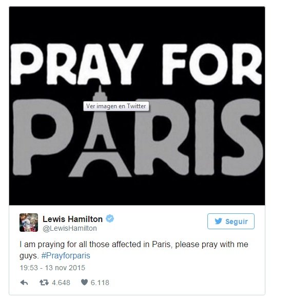 Uno de ellos fue el piloto inglés Lewis Hamilton, quien en su cuenta de Twitter señaló que pide por todos los afectados, acompañado de una imagen con la frase “Pray for Paris”.
