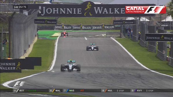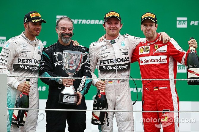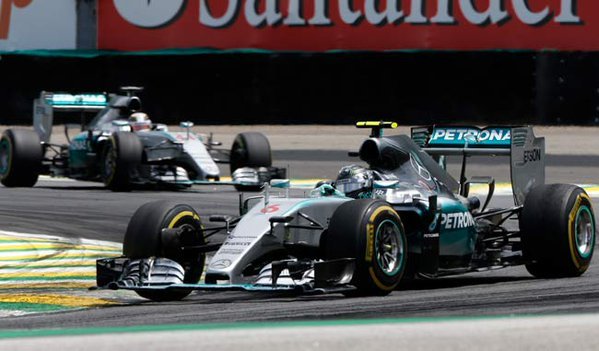 Nico Rosberg obtuvo una clara pero nada cómoda victoria en el Gran Premio de Brasil, donde su compañero de equipo, Lewis Hamilton, lo siguió de cerca durante gran parte de la misma. Sebastian Vettel completó el podio.