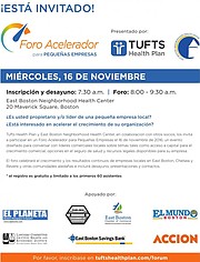 Tufts Health Plan junto a East Boston Neighborhood Health Center, en colaboracion con otros socios, están invitando a participar en un Foro Acelerador para Pequeñas Empresas, que celebrará el crecimiento y los resultados continuos de empresas locales en East Boston, Chelsea y Revere y otras comunidades aledañas e incluirá desayuno, presentaciones y contactos.