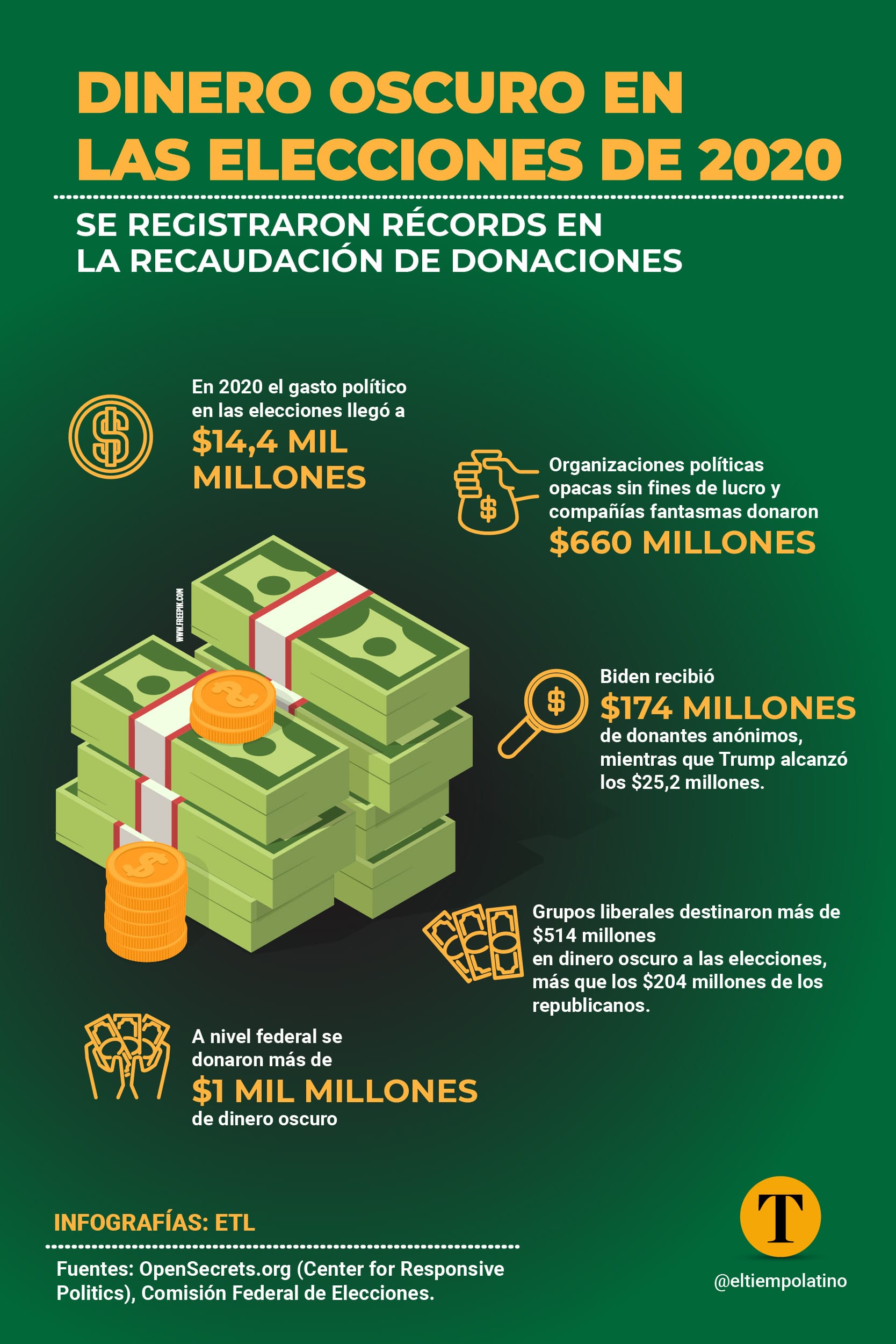 El portal web OpenSecrets.org del Center for Responsive Politics, grupo que investiga y rastrea el dinero oscuro, informó que en las elecciones federales de 2020 se gastaron más de $1 mil millones por parte de organizaciones cuyos donantes no son identificados. De esa cifra, más de $654 millones provienen de solo 15 grupos.