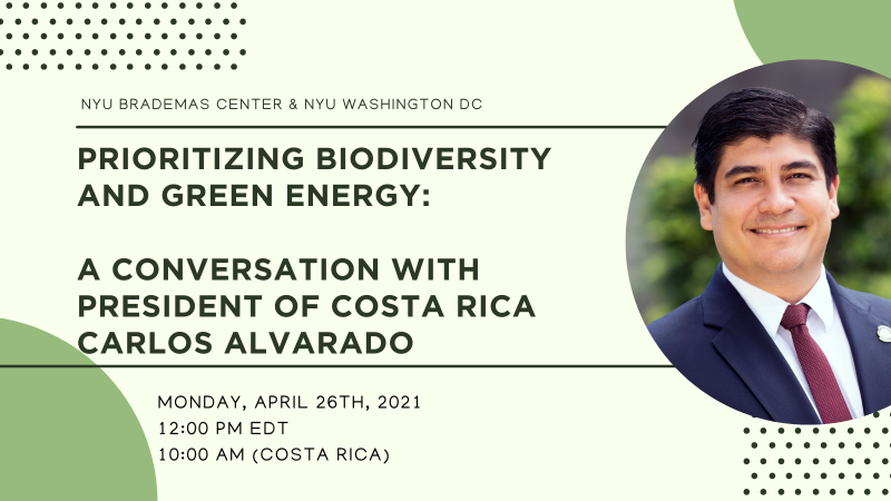 El NYU Brademas Center y la Universidad de Nueva York (NYU Washington, DC), realizarán un diálogo virtual abierto al público con el presidente de la República de Costa Rica, Carlos Alvarado Quesada. La discusión ocurrirá a escasos días de la celebración de la Cumbre Virtual contra el Cambio Climático que organiza el presidente de los Estados Unidos, Joe Biden, con los países responsables del 80 % de las emisiones globales de dióxido de carbono, que se llevará a cabo en abril.