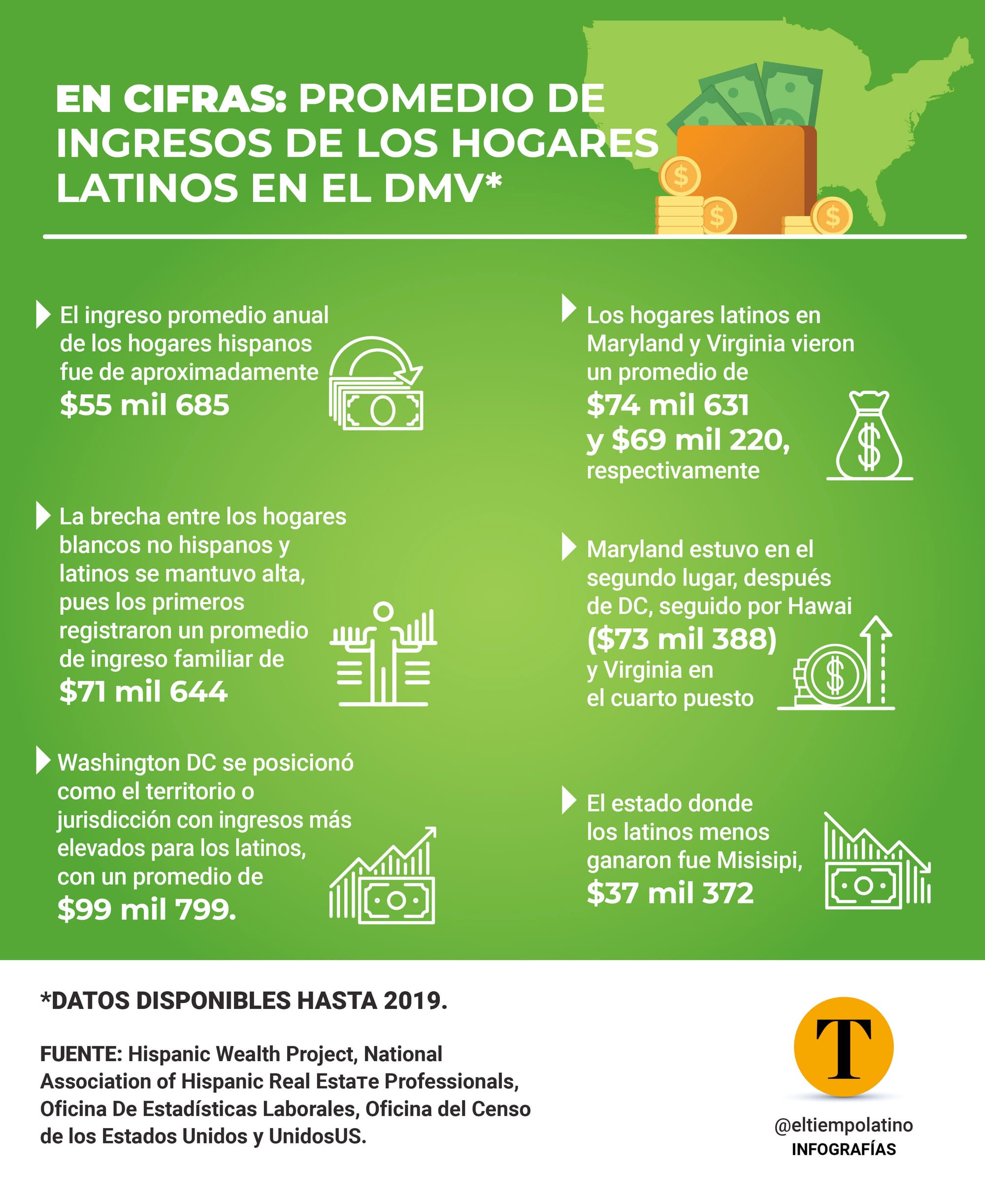 Washington DC se posicionó como el territorio o jurisdicción con ingresos más elevados para los latinos en 2019, con un promedio de $99 mil 799, seguido de Maryland ($74 mil 631), Hawái ($73 mil 388) y Virginia ($69 mil 220) en el cuarto lugar.
