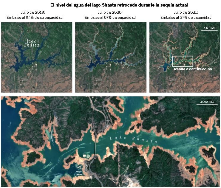 Los dos embalses más grandes de California, el lago Shasta y el lago Oroville, están en camino de alcanzar mínimos récord este verano, ahora al 37% y al 31% de sus capacidades totales, respectivamente.