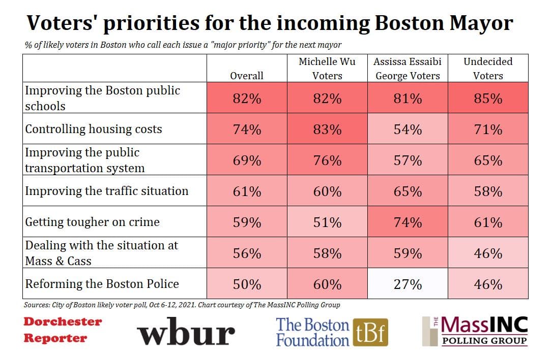 En general, las tres cuartas partes de los votantes señalaron que la vivienda era un tema principal. Pero el tema fue particularmente importante para las personas que respaldan a la concejal Michelle Wu para la alcaldía. Alrededor del 85% de los partidarios de Wu calificaron los costos de vivienda como una prioridad, en comparación con solo el 45% de los partidarios de Annissa Essaibi George.