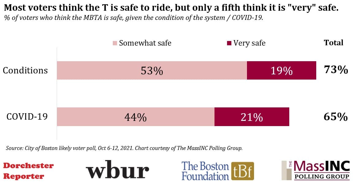 La encuesta ( línea superior, tablas de referencias  cruzadas ) encontró que el 73% de los votantes probables de Boston calificaron a la MBTA como al menos algo segura. Pero solo el 19% lo llamó «muy seguro».