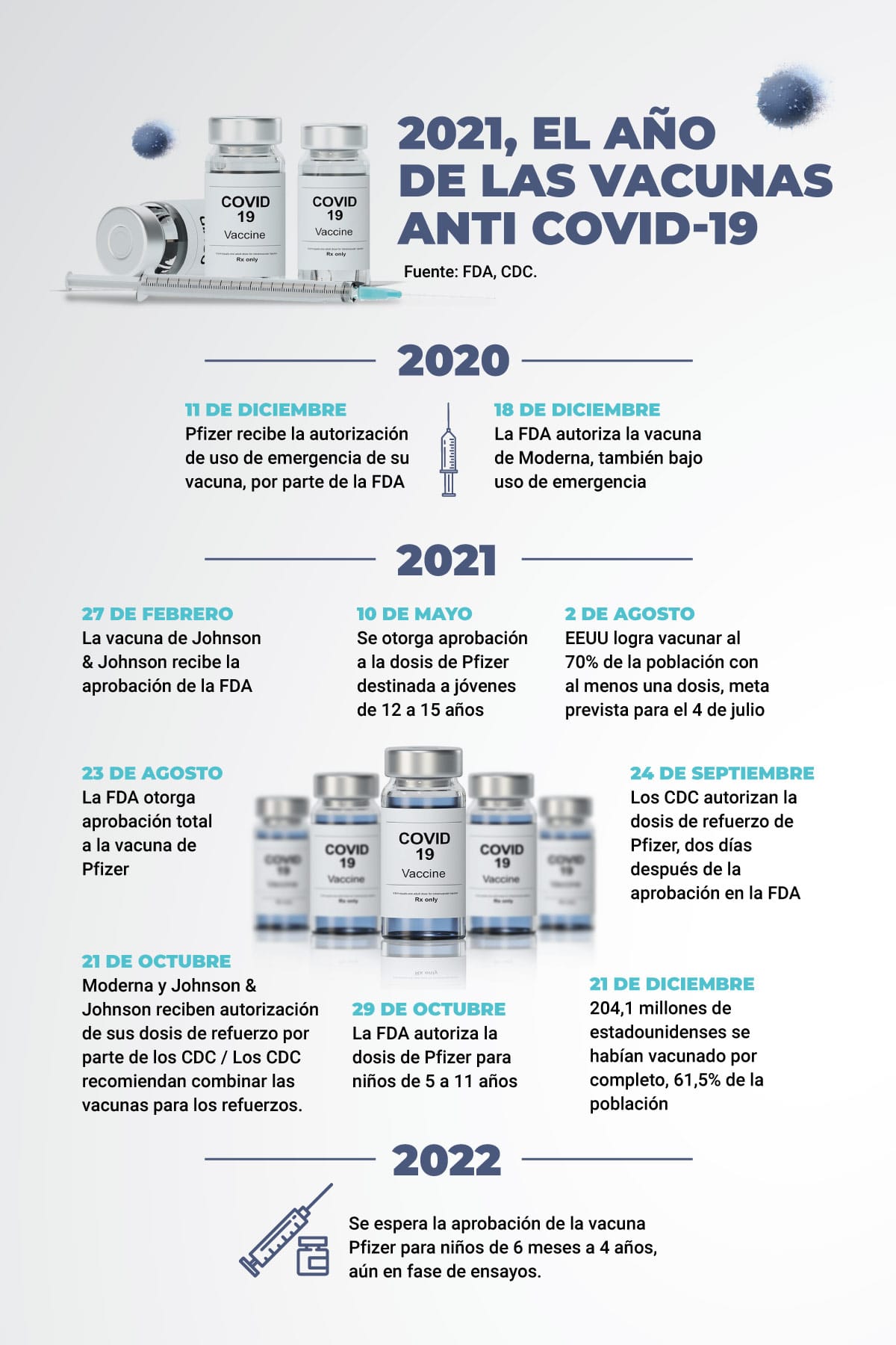 Hasta el lunes 27 de diciembre, en Estados Unidos más de 242,4 millones de personas habían recibido al menos una dosis de la vacuna, un 73% de la población elegible mayor de 5 años; mientras que 205,1 millones de residentes estaban completamente inmunizados, el 61,8% de los habitantes, de acuerdo con datos de los Centros para el Control y Prevención de Enfermedades (CDC).