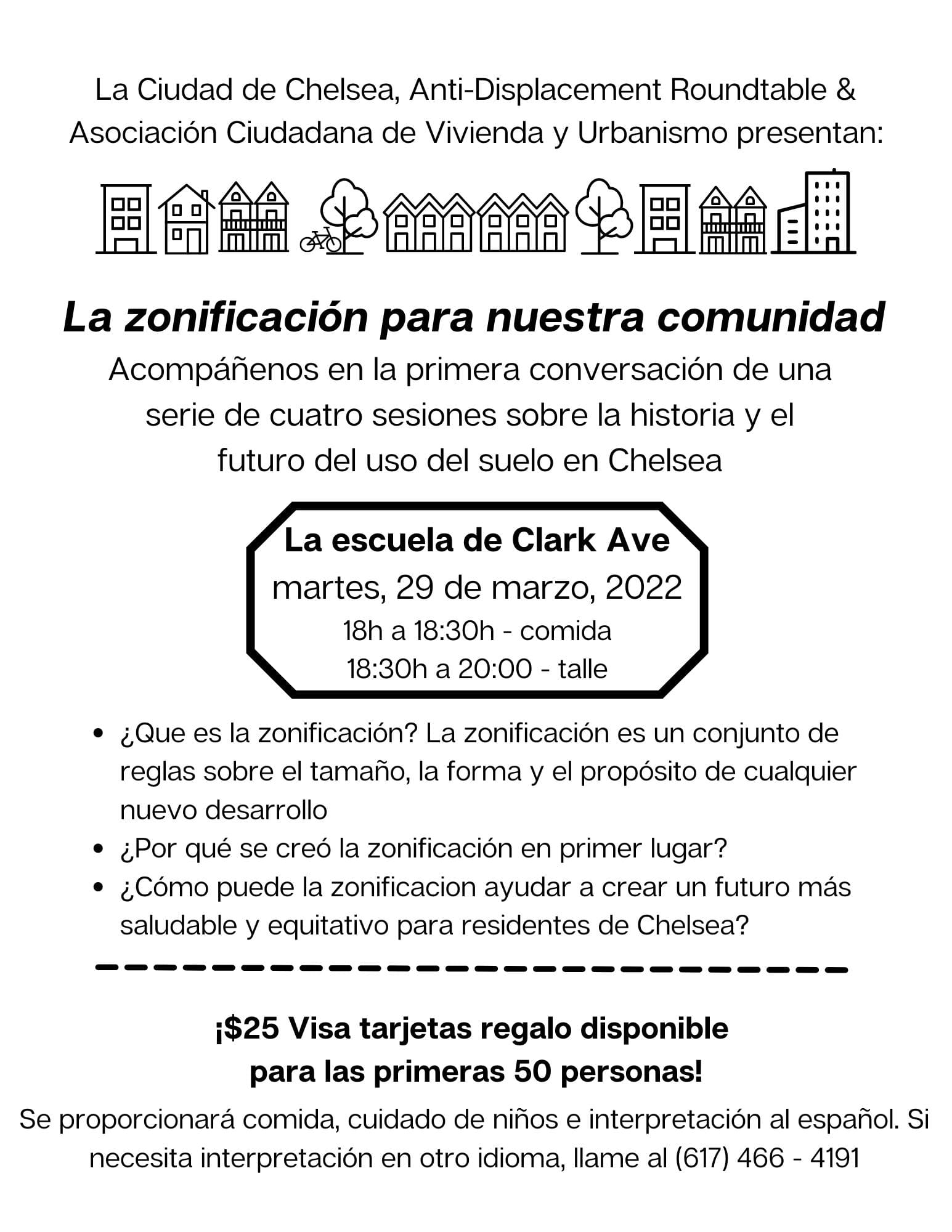 La ciudad se asoció con la Anti-Displacement Roundtable y la Citizens’ Housing and Planning Association (CHAPA) para ofrecer una Serie de Conversaciones Comunitarias de cuatro sesiones sobre sobre el desarrollo local.