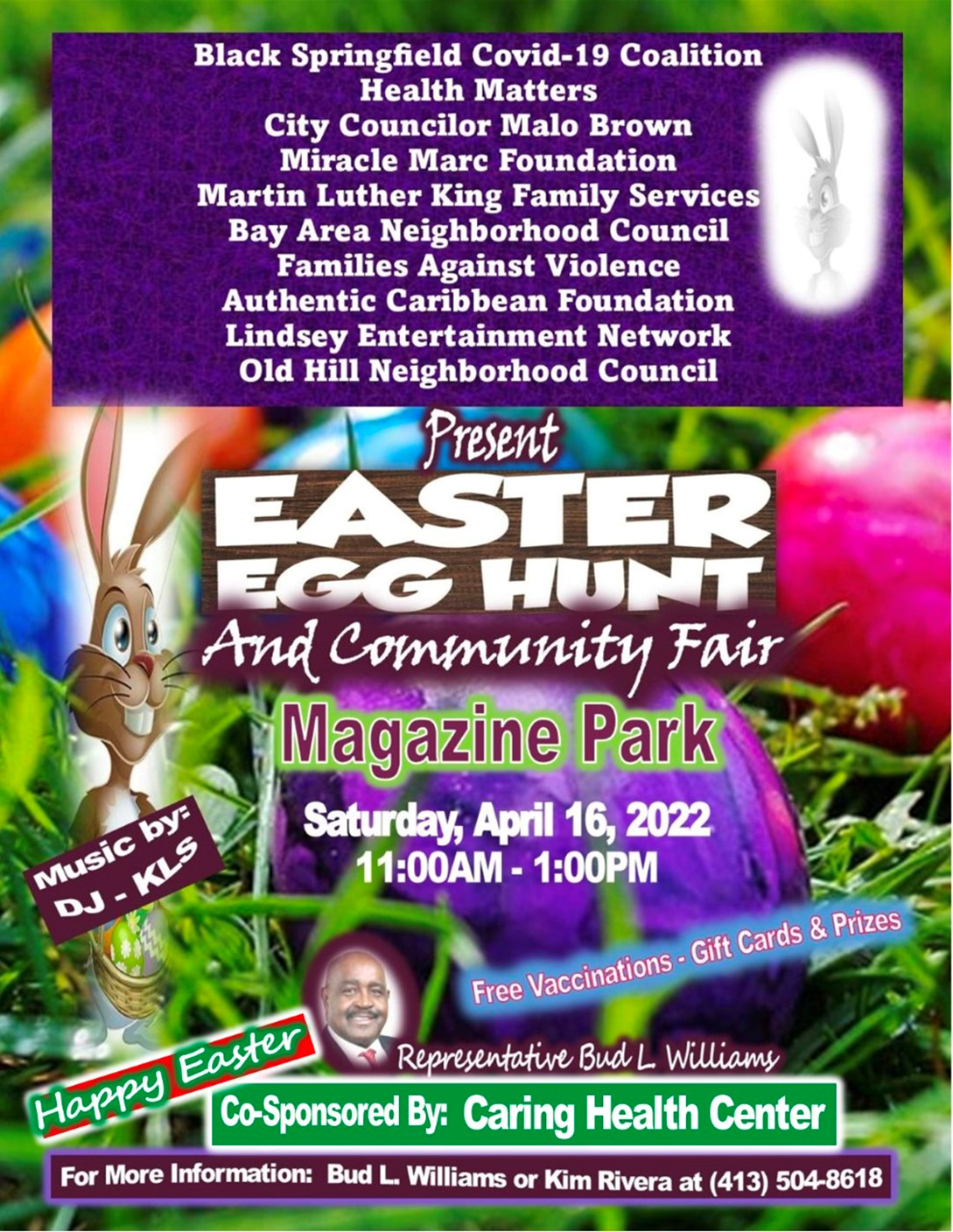 “A medida que el clima se vuelve más cálido y la comunidad está emocionada por salir del confinamiento asociado con la pandemia, tiene sentido celebrar las vacaciones de Pascua con un evento lleno de diversión (…) una especie de resurrección”, afirmó Williams. “Coordinado por mi asistente legislativa, Kim Rivera, residente de Springfield desde hace mucho tiempo, este evento es verdaderamente una colaboración de la comunidad y organizaciones”.