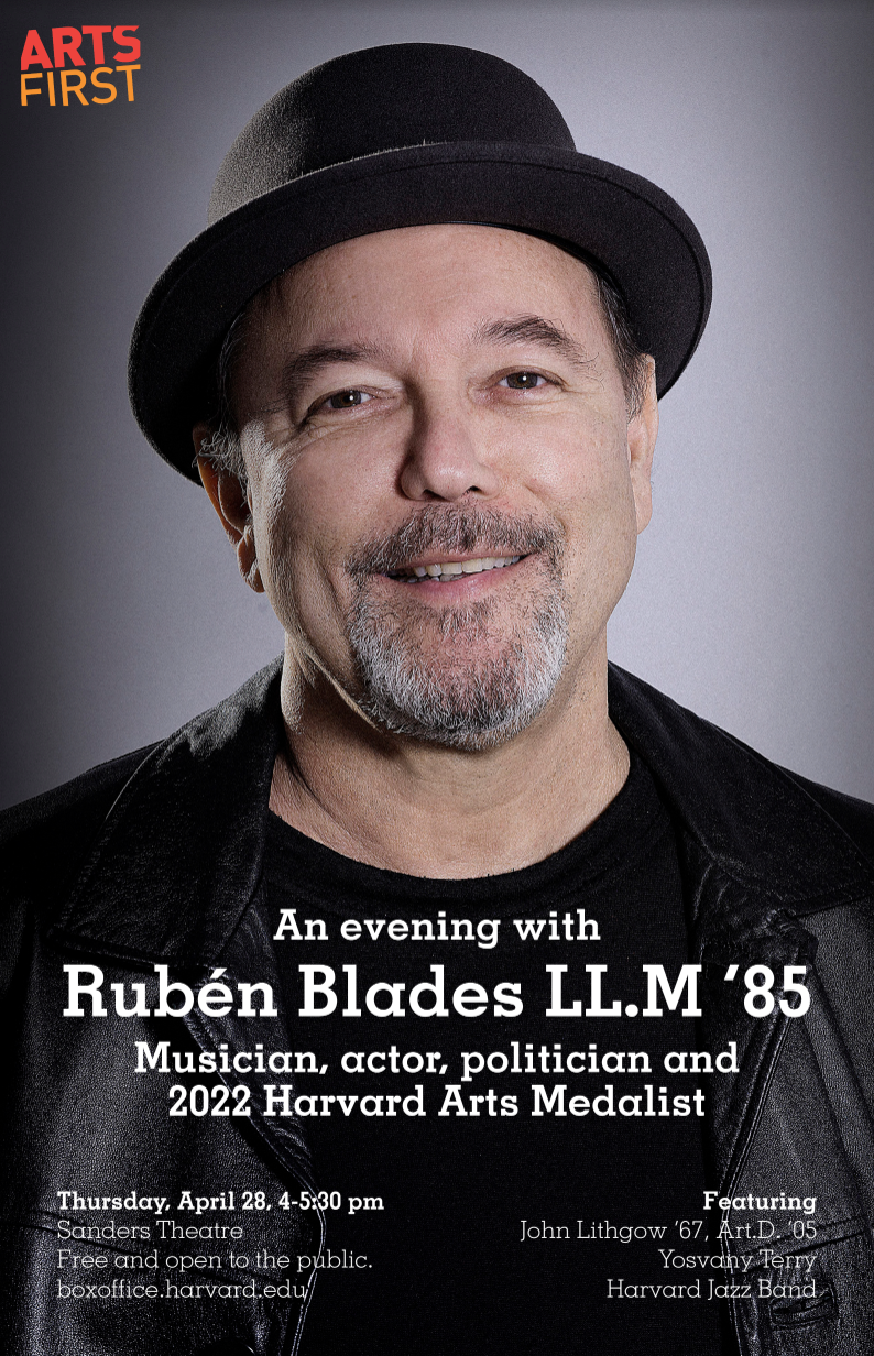 El exalumno de Harvard, Rubén Blades, será homenajeado y recibirá la Medalla de las Artes de Harvard, el premio artístico más distinguido que la universidad otorga a un exalumno, el jueves 28 de abril a las 4:00 p.m. en el Sanders Theatre.