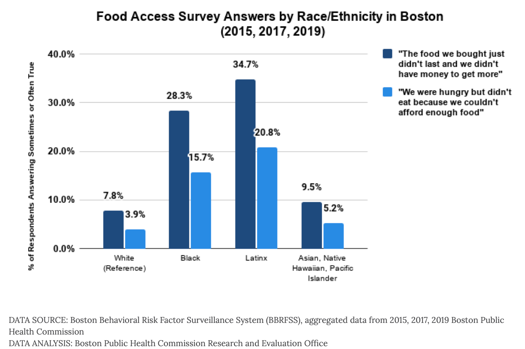 La alcaldía de Boston indicó que comunidades como Roxbury, Dorchester y Mattapan consistieron en las ciudades con mayor porcentaje de inseguridad alimentaria en el 2018. “Las familias con ingresos anuales de menos de $25,000 tenían más de ocho veces probabilidades de tener inseguridad alimentaria a una tasa del 38,5 % que los hogares con ingresos anuales de más de $50,000, los cuales reportaron inseguridad alimentaria, a una tasa del 4,5 %”, informó la Oficina de Acceso de Alimentos (OFA), por sus siglas en inglés.