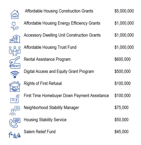 ARPA (American Rescue Plan Act) proporciona fondos necesarios para responder y recuperarse de la pandemia de COVID-19 y los efectos económicos negativos que la acompañaron. Salem ha adoptado un enfoque reflexivo para utilizar estos fondos y ha trabajado intencionalmente con las partes interesadas para identificar enfoques a corto y largo plazo que ayudarán a mejorar los esfuerzos de respuesta y recuperación. Salem está listo para responder estratégicamente a las desviaciones en el curso de la pandemia para garantizar una recuperación equitativa y realizar un cambio positivo y transformador en las áreas de preocupación que afectan las vidas y los medios de subsistencia de los residentes de Salem. La ciudad ya ha anunciado asignaciones importantes de fondos ARPA para necesidades críticas de capital de la Ciudad, más detalles aquí.