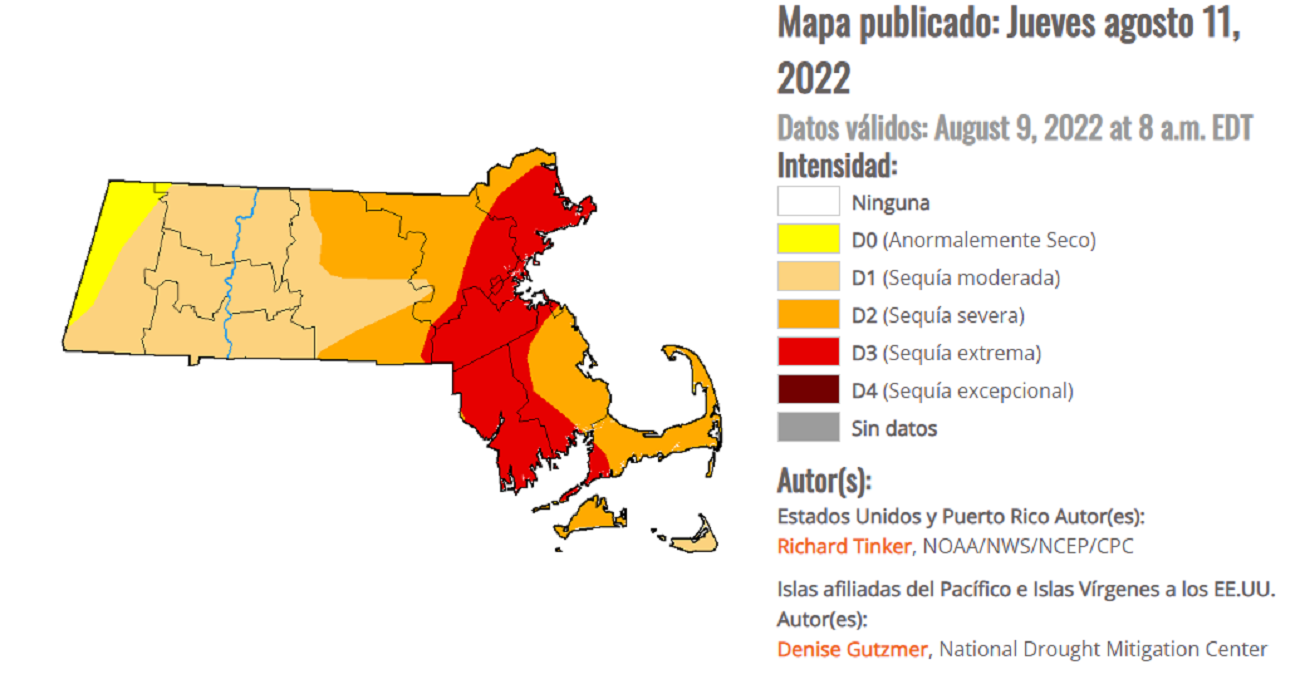 Aproximadamente el 25 % del estado de Massachusetts ha sido catalogado como «Sequía Extrema» según las condiciones publicadas el jueves 11 de agosto por el Monitor de Sequía de los Estados Unidos, en su publicación indica que los lugares como Cape Cod, el valle de Merrimack y el condado de Worcester permanecen bajo «Condiciones de Sequía Severa», el área extrema se extiende desde Cape Anne a través de Greater Boston desde el sureste de Massachusetts hasta la frontera con Rhode Island.
