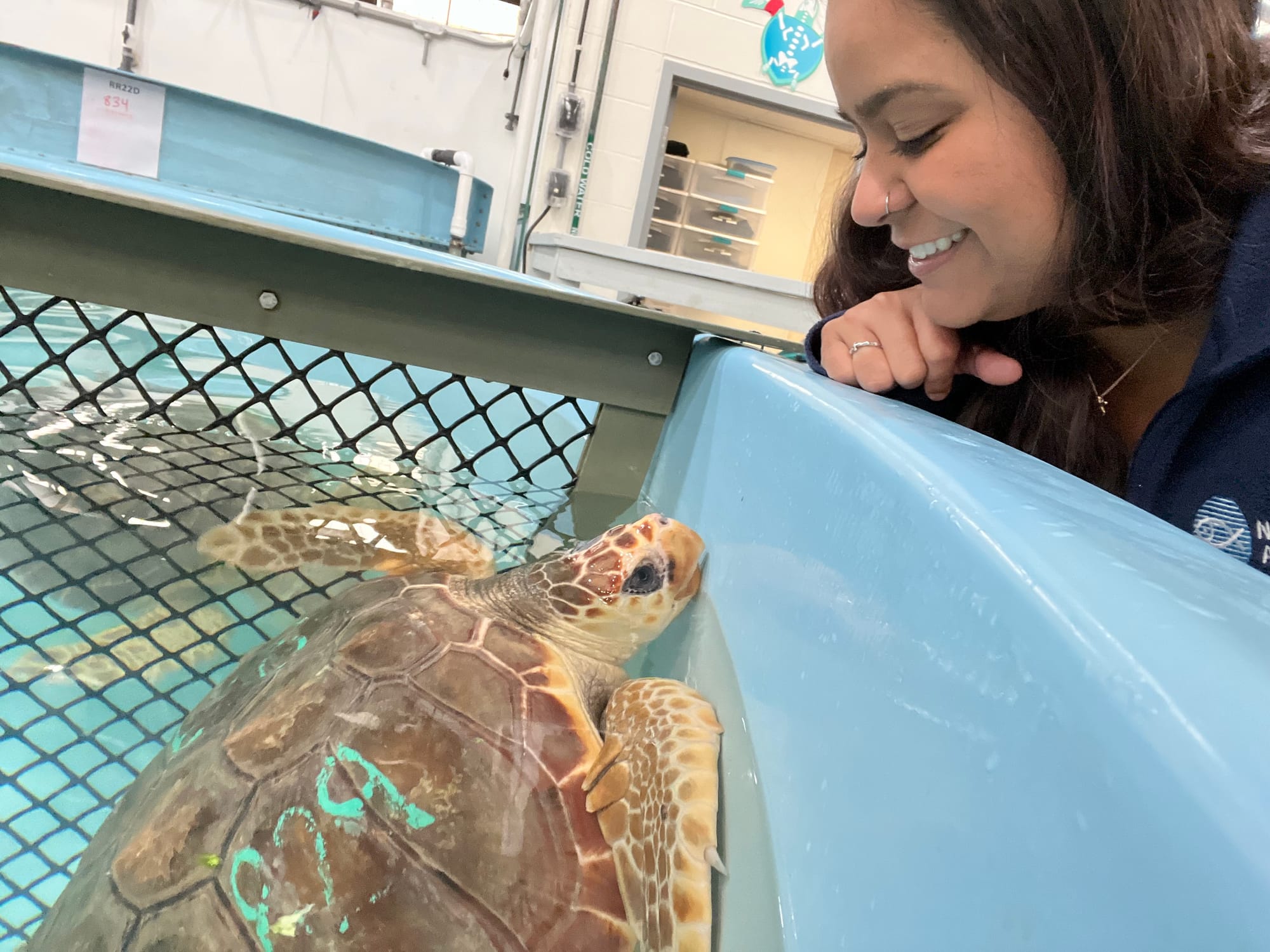 Marisa Bernal junto a una tortuga en el New England Aquarium