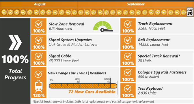 También se han completado las pruebas de señalización en Malden y Oak Grove, y se realizarán trabajos de señalización adicionales en la Línea Naranja en una fecha posterior para hacer la transición de toda la línea al nuevo sistema de señalización. Todo el resto del trabajo ha sido completado.