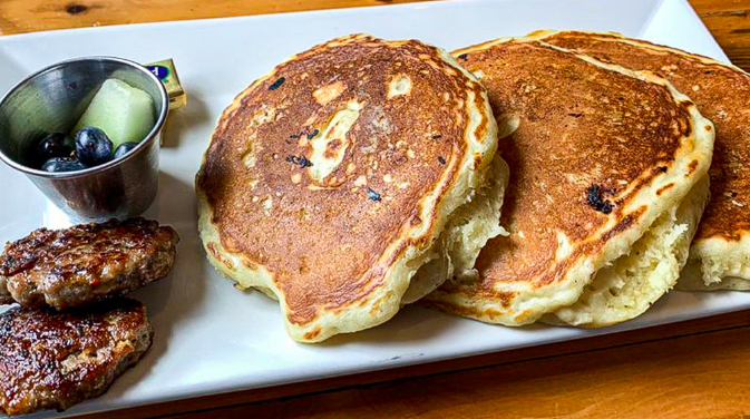 Los Yelpers dicen: “La salchicha de arce fue fantástica; la galleta era enorme, esponjosa por dentro, con un agradable crocante por fuera. Muchos lugares a menudo escatiman en las papas fritas caseras, pero estas eran crujientes y sabrosas. Los panqueques de suero de leche de mi esposo eran ENORMES, pero estuvo a la altura del desafío. —Jenn S.