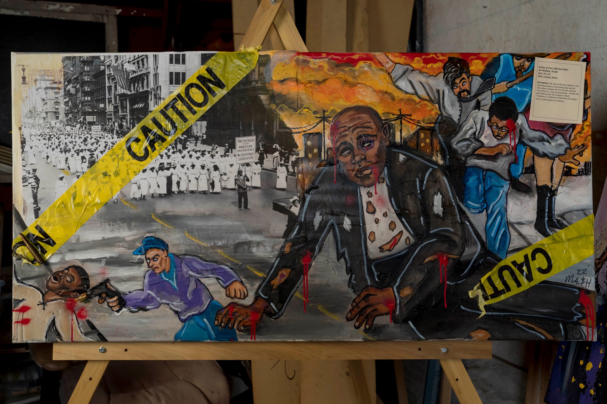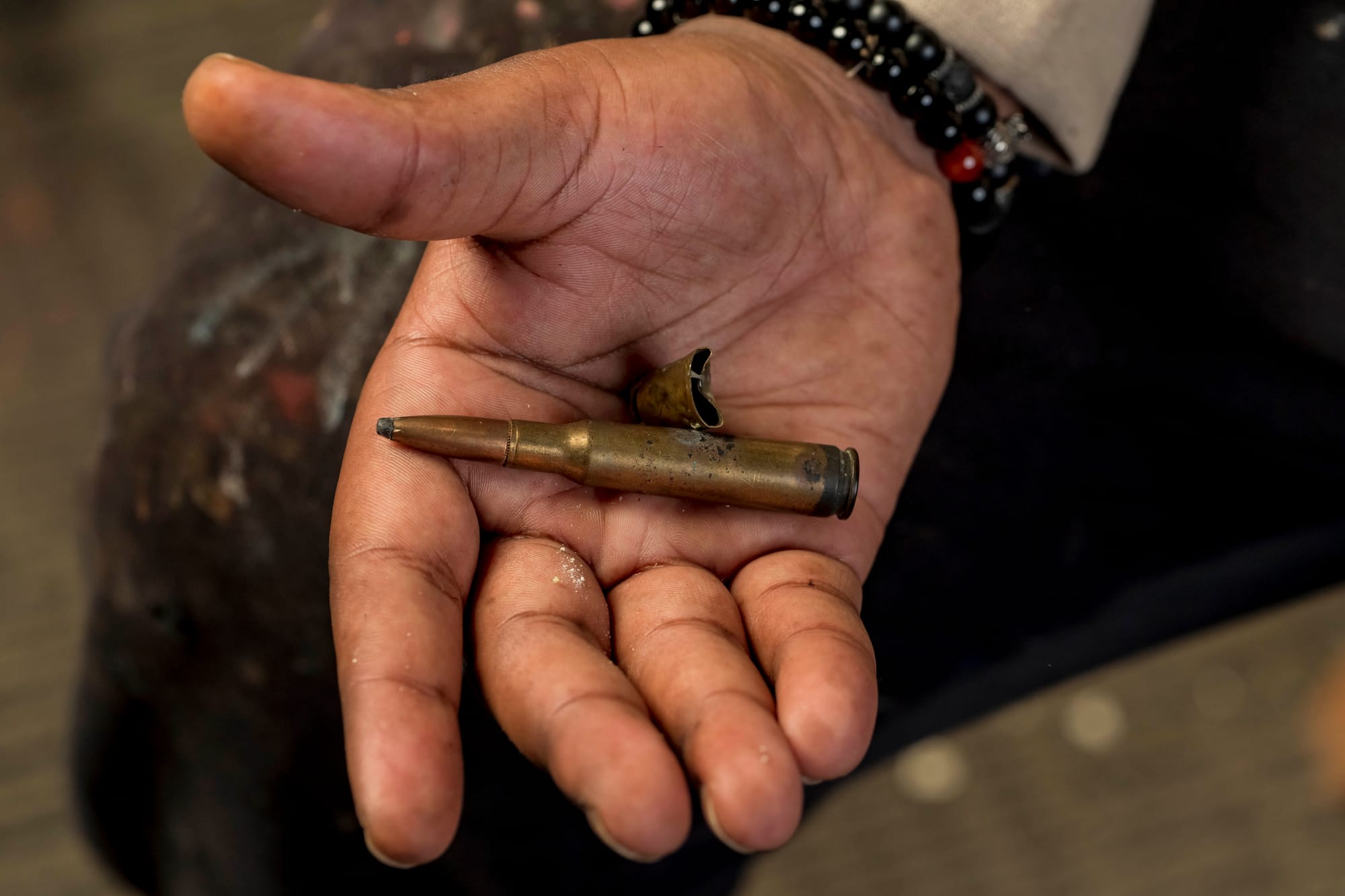 En el estudio de Ash, municiones usadas se mezclan con llantas trituradas, vidrios rotos y pintura para transformar la basura de la violencia en arte que cuenta historias sobre la raza, la resistencia y la historia. El trabajo es personal, dijo Ash.