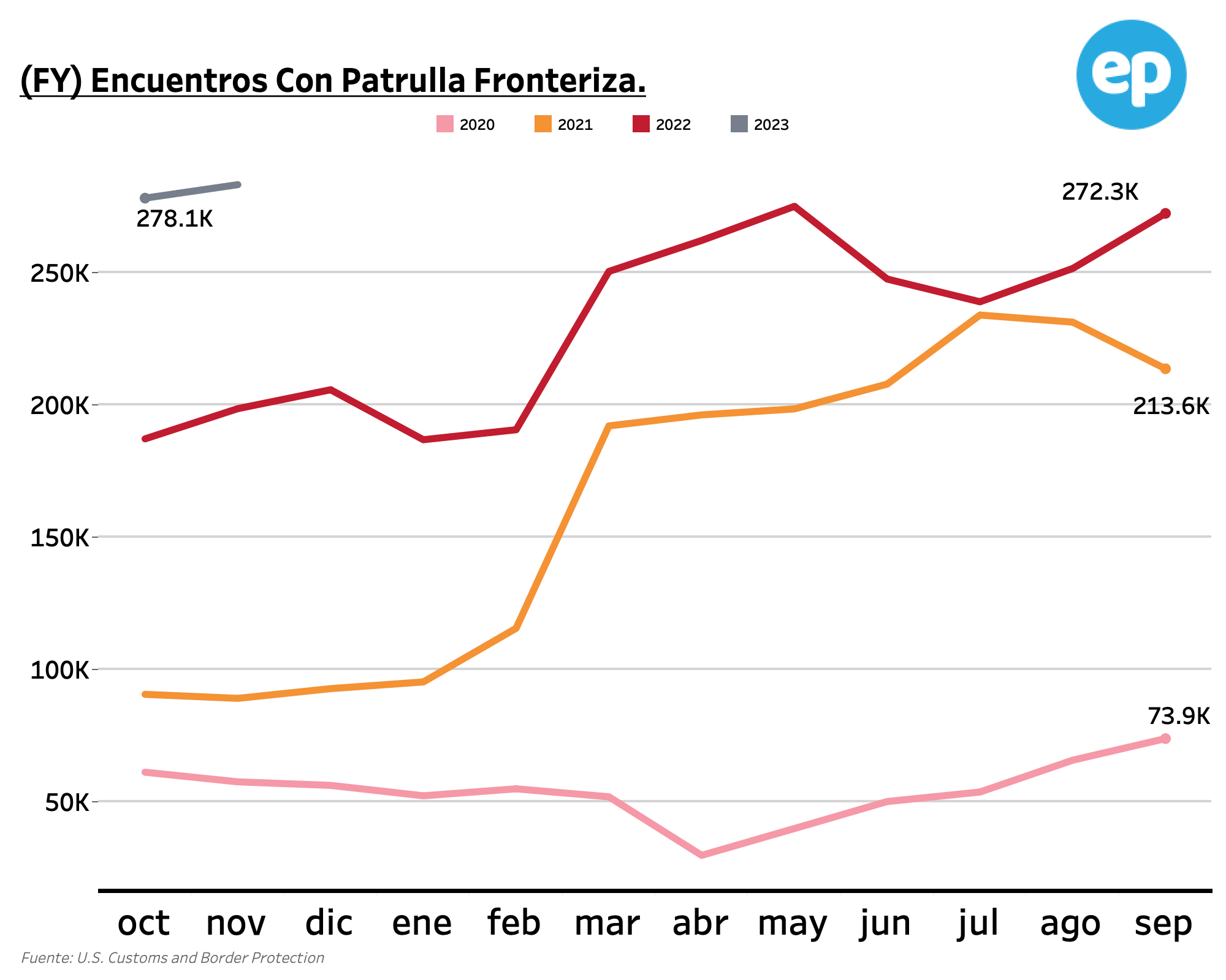 Los encuentros mensuales entre agentes de la Patrulla Fronteriza estadounidense con migrantes que intentan entrar en Estados Unidos se mantienen en los niveles más altos de las dos últimas décadas, según estadísticas del Gobierno. En 2022, el Servicio de Aduanas y Protección de Fronteras de Estados Unidos informó de casi 2,8 millones de encuentros con inmigrantes en la frontera sur.
