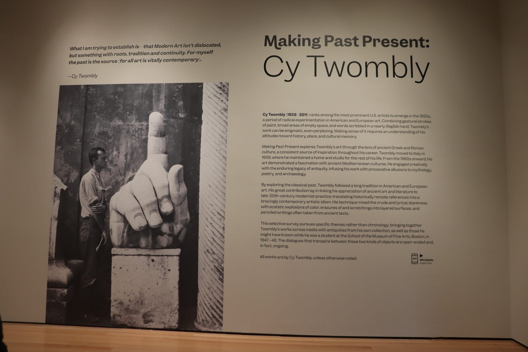 “Making Past Present: Cy Twombly” explora la fascinación de toda la vida del artista por la mitología, la poesía y la arqueología de la antigüedad y revela cómo moldeó su visión creativa. El arte antiguo se manifiesta en el trabajo de Twombly en formas y gestos a menudo sutiles y no literales.