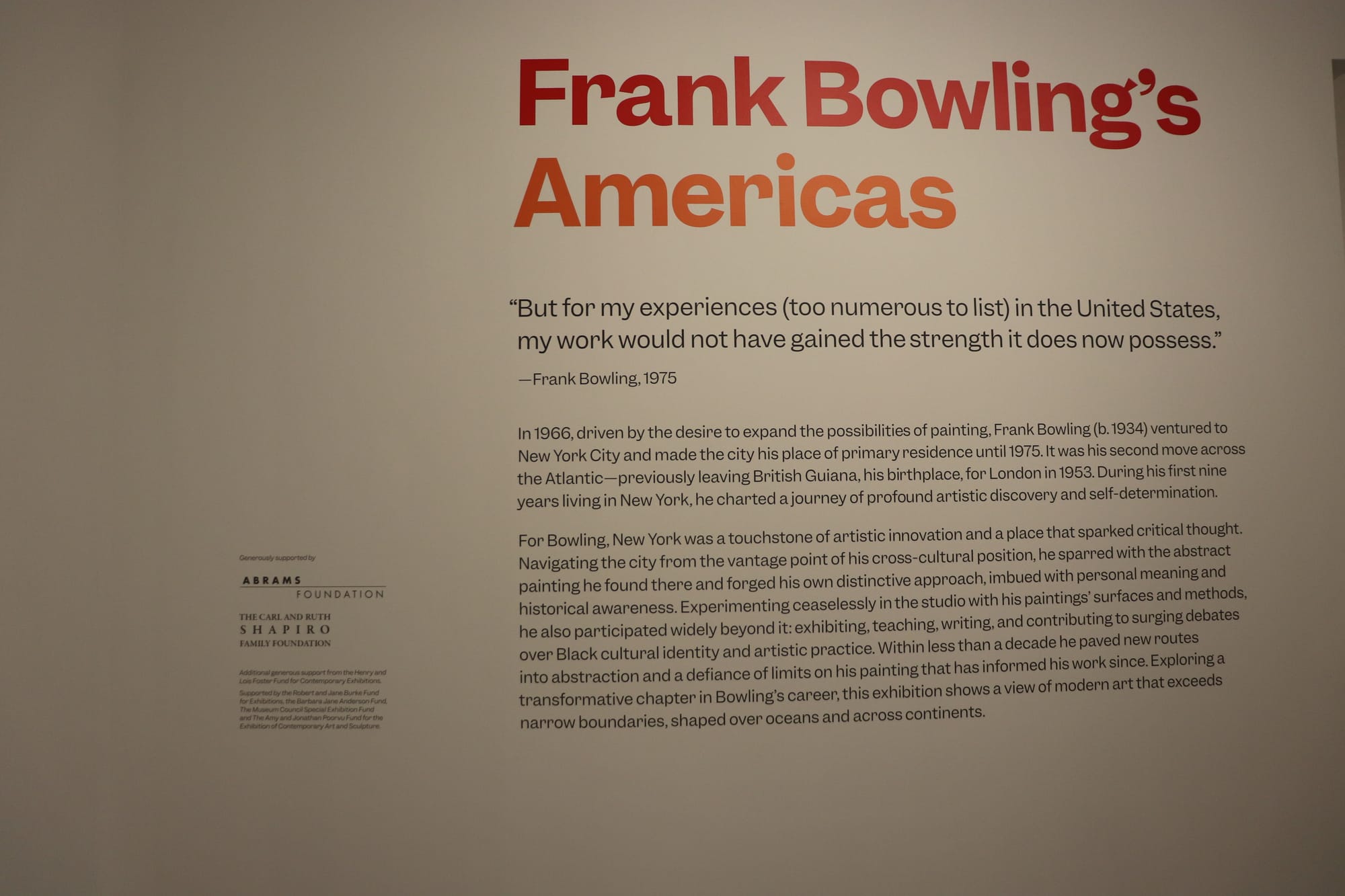 El artista nació en la Guayana Británica Frank Bowling en 1966 y luego se mudó de Londres a la ciudad de Nueva York, impulsado por la ambición de dejar su huella en la pintura moderna. «Frank Bowling’s Americas» es la primera exposición dedicada a los años transformadores que el artista pasó en los EE. UU. y la primera gran encuesta de su obra realizada por una institución estadounidense en más de cuatro décadas.