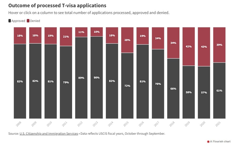 Y los defensores de los inmigrantes afirman que la tramitación de las solicitudes de T-visa puede llevar demasiado tiempo, que se deniegan demasiadas solicitudes y que no se sabe quién puede optar a ellas. Aunque el gobierno federal autoriza hasta 5.000 visados T al año, sólo se expide una pequeña parte de ese número: una media de poco más de 600 al año entre 2008 y 2022, según datos federales.