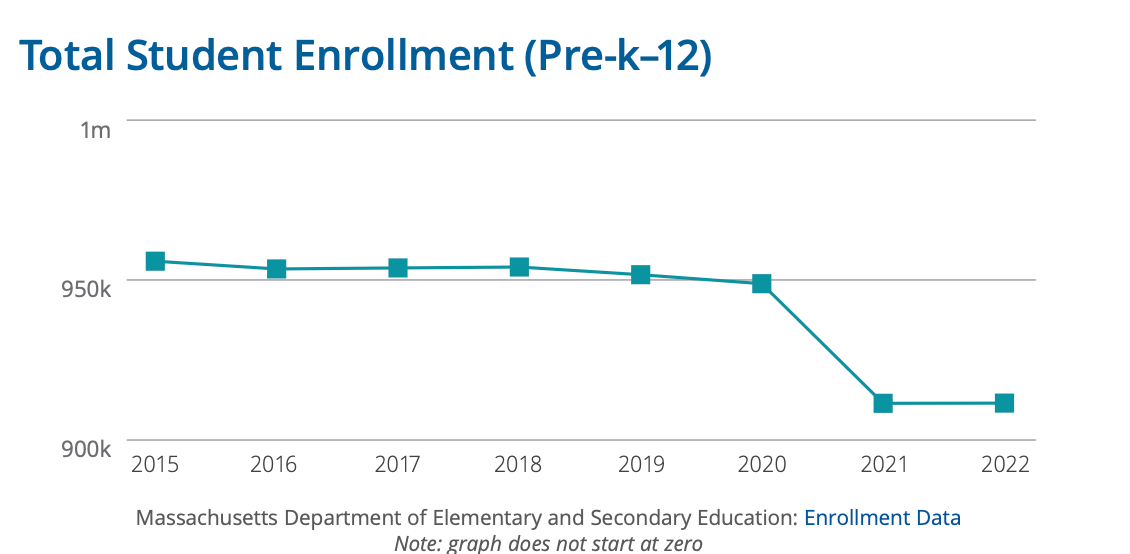 La política del estado de Massachusetts define la inscripción de kindergarten de día completo como un mínimo de 850 horas por año. A partir de 2022, la matriculación en jardín de infantes de jornada completa en todo el Estado Libre Asociado se encuentra en niveles casi universales, con el 99 % de los niños matriculados. A pesar de una breve caída en medio de la pandemia en 2021, los niveles de kindergarten de día completo se han mantenido por encima del 91 % desde 2015, y la tendencia hacia la demanda de inscripción de día completo sigue aumentando.