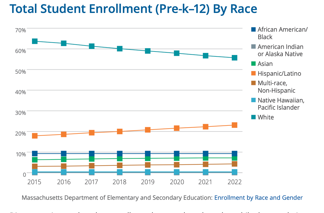 A pesar de los esfuerzos realizados por las escuelas y los distritos de todo el Commonwealth para volver a las aulas y los edificios escolares físicos, la tasa de ausentismo crónico, definida como el porcentaje de estudiantes que faltan a la escuela el 10 % o más de los días inscritos, aumentó de 17 % al 27 % para todos los estudiantes entre 2021 y 2022. Más preocupante, cuando se desglosan por raza, los datos de 2022 muestran que el 42 % de los estudiantes que se identificaron como hispanos/latinos estuvieron crónicamente ausentes, junto con el 38 % de los estudiantes que se identificaron como indios americanos o latinos. Nativo de Alaska, el 32 % se identifica como nativo de Hawái o de las islas del Pacífico y el 32 % se identifica como afroamericano/negro.