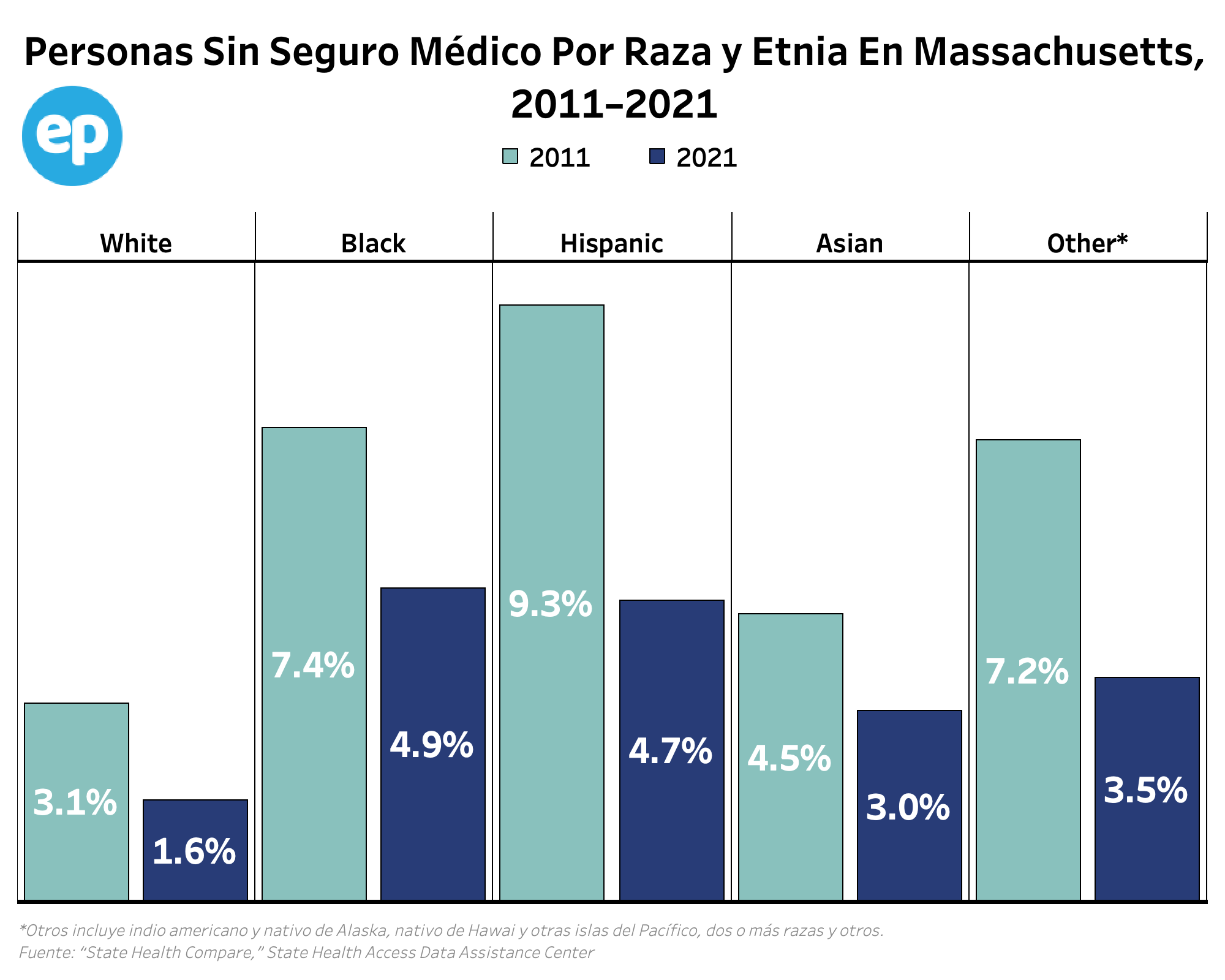 Estas disparidades en el acceso y los resultados de la atención sanitaria se deben en parte a las mayores tasas de inelegibilidad para la cobertura basadas en el estatus migratorio y a la falta de acceso a las opciones de seguro médico público y patrocinado por el empleador. Los inmigrantes, que son desproporcionadamente hispanos en Massachusetts, a menudo trabajan para empresas que no ofrecen seguro médico. Según un estudio de la fundación Blue Cross Blue Shield de Massachusetts, los blancos tienen 9 y 13 puntos porcentuales más de probabilidades que los afroamericanos y los hispanos, respectivamente, de estar afiliados a un seguro de empresa.