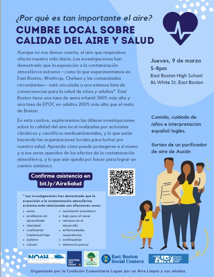 Con el fin de crear conciencia sobre efecto de la exposición a la contaminación atmosférica a una larga lista de consecuencias para la salud en niños y adultos, la Coalición Comunitaria Logan por un Aire Limpio y sus aliados estarán presentando el día 9 de marzo, una conferencia sobre la calidad del aire en East Boston, denominada: “East Boston Air Quality Summit”.