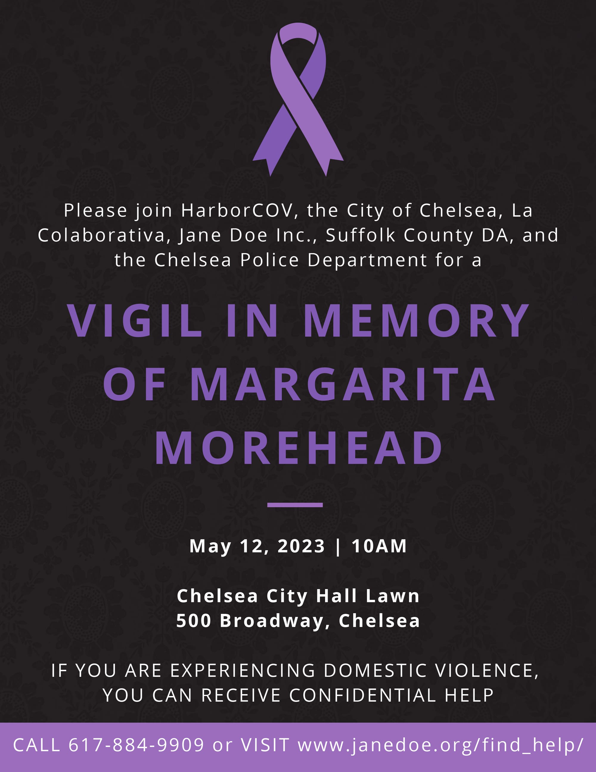 En colaboración con La Colaborativa, la ciudad de Chelsea, el Departamento de Policía de Chelsea, el fiscal del condado de Suffolk y Jane Doe Inc., HarborCOV organizará una vigilia comunitaria en Chelsea el viernes 12 de mayo a las 10 de la mañana en el Ayuntamiento de Chelsea para honrar la vida de Morehead y concienciar sobre la letalidad de la violencia doméstica.