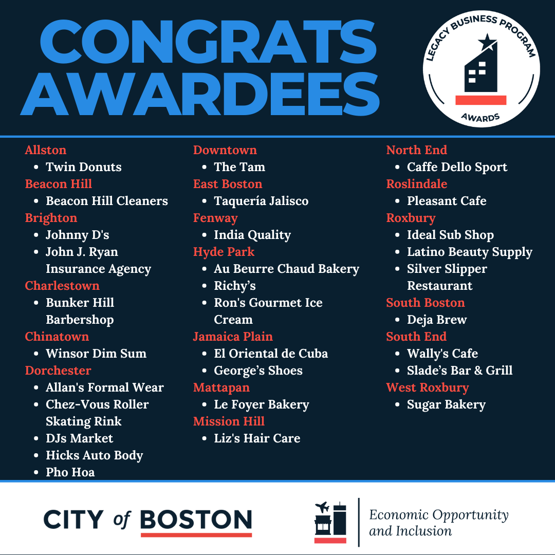 “Nuestros negocios heredados son pilares en nuestras comunidades y amplían las oportunidades para nuestros residentes y familias en todo Boston”, dijo la alcaldesa Michelle Wu. “Estoy encantado de poder honrar a estas empresas básicas que invierten y mejoran nuestras comunidades. Felicitaciones a nuestras treinta empresas heredadas recientemente seleccionadas y esperamos poder apoyar estas empresas fundamentales en los vecindarios de Boston en los años venideros”.