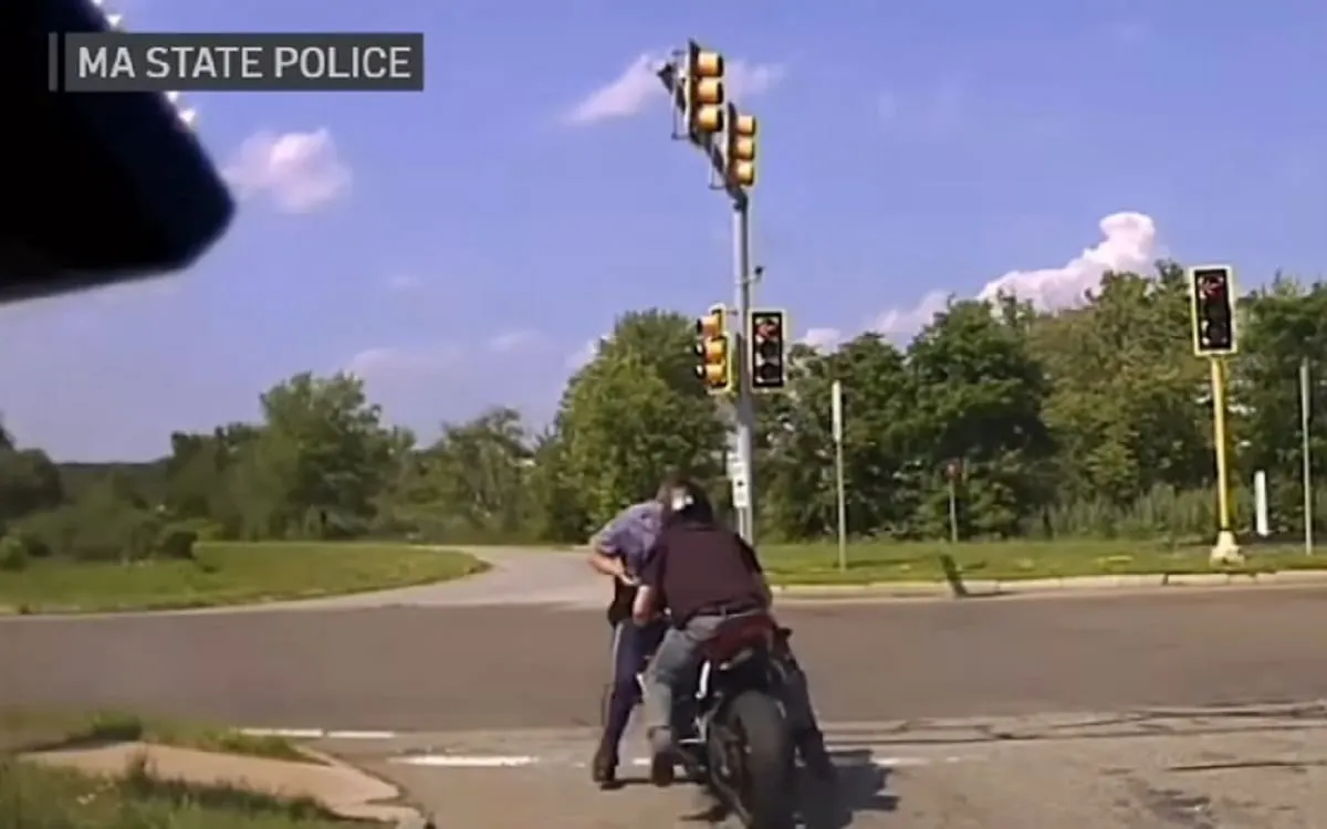 El oficial pudo soltarse de la motocicleta mientras avanzaba, lo que le permitió evitar ser atropellado por una camioneta que pasaba por la intersección. Un video que muestra el incidente, fue publicado por el Departamento de Policía de Massachusetts.