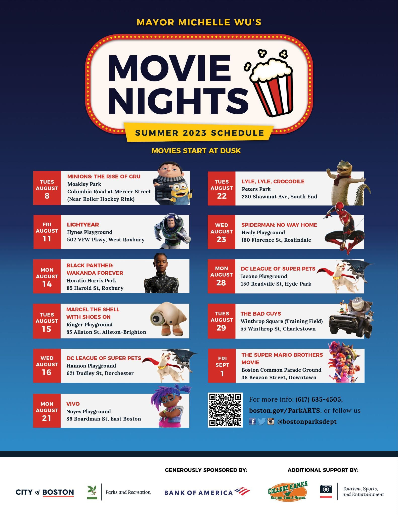 The Boston Parks and Recreation Department’s ParkARTS program presentará «Noches de Cine» («Parks Movie Nights») de la Alcaldesa Wu en 11 parques de la ciudad, desde el martes 8 de agosto hasta el viernes 1 de septiembre.