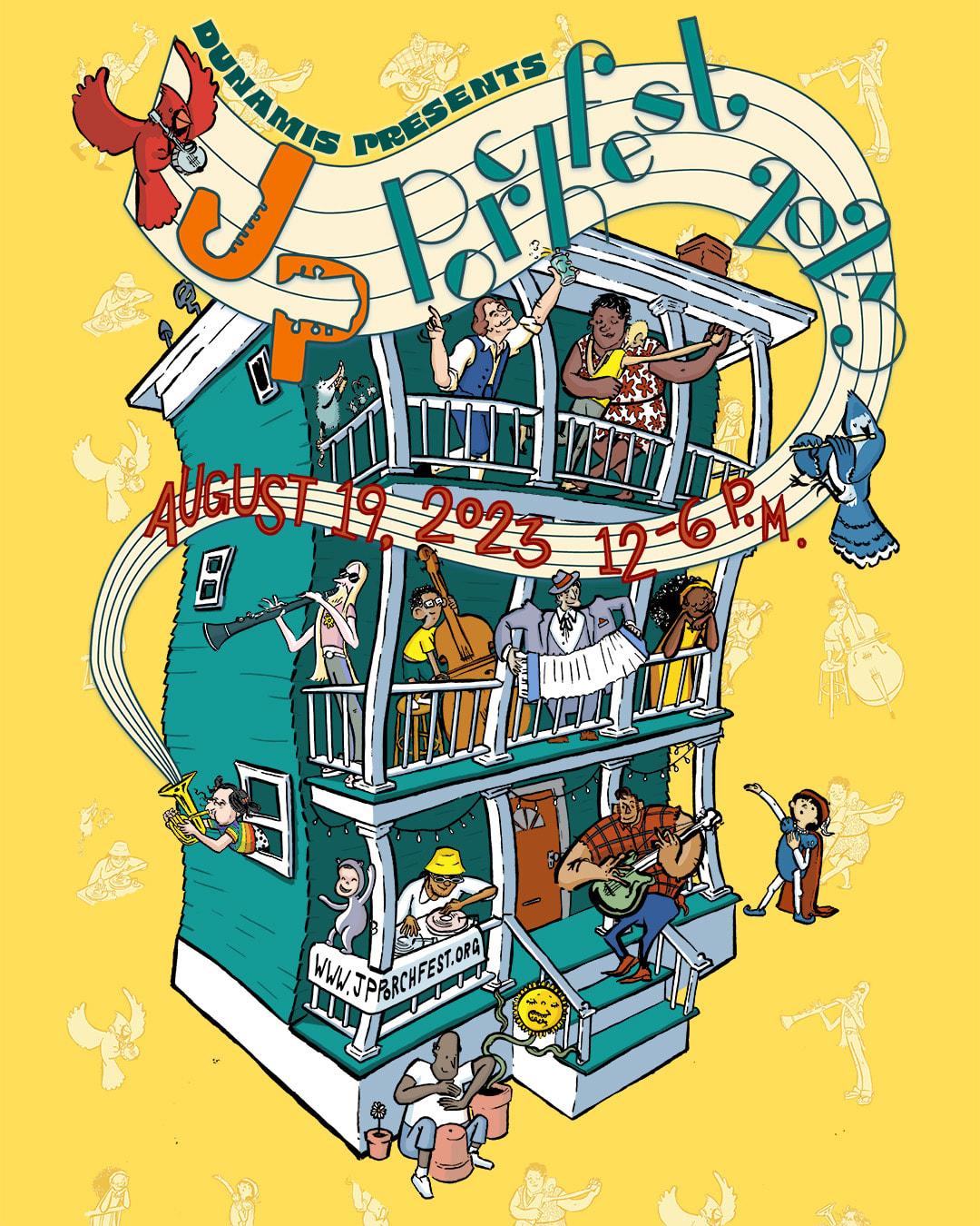 JP Porchfest es un festival anual de arte comunitario que se lleva a cabo en negocios locales y porches de residentes en todo el vecindario de Jamaica Plain.
