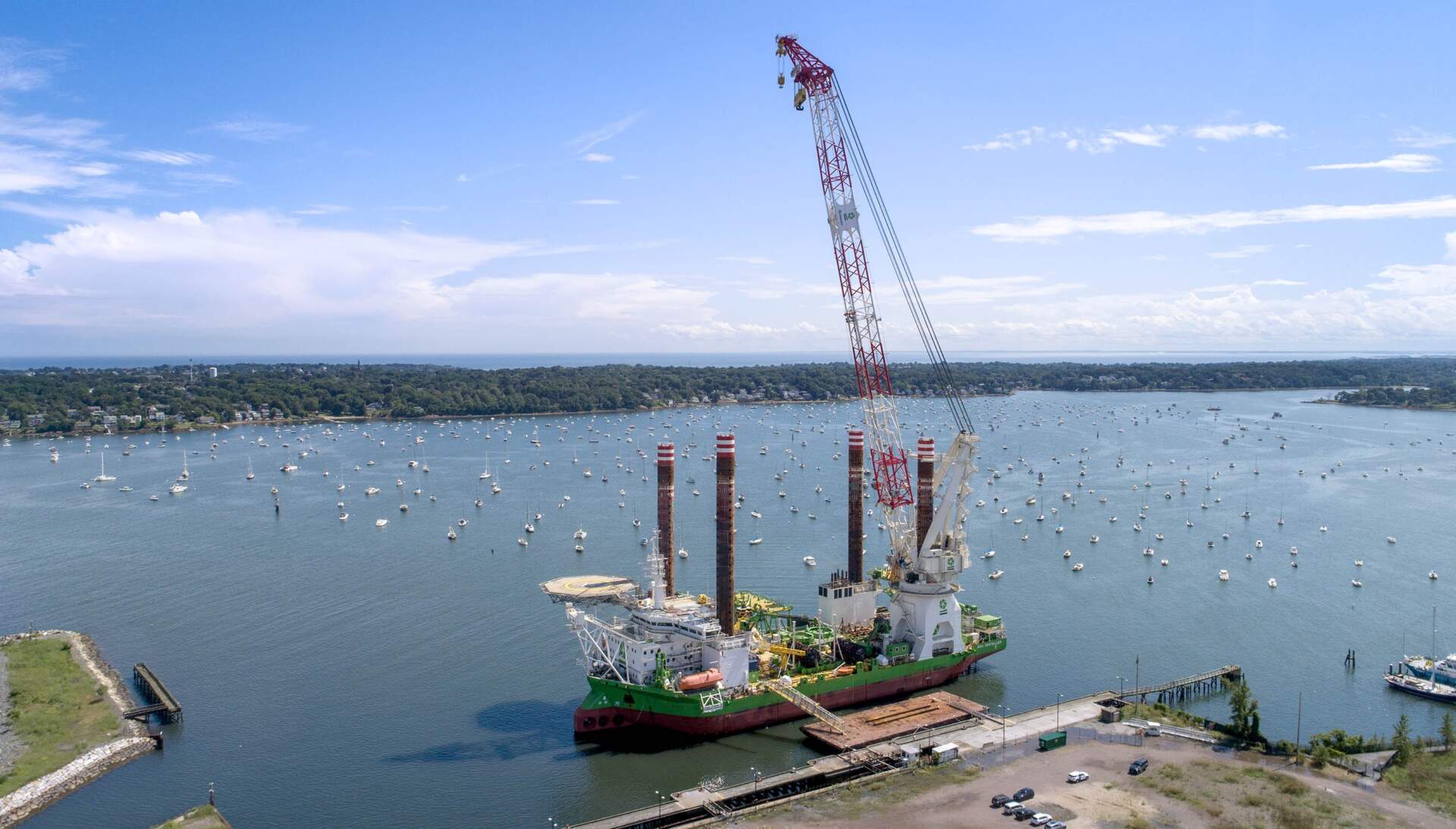 Una vez que la barcaza llega al área de arrendamiento eólico cerca de Martha’s Vineyard, los componentes de la turbina serán transferidos al Sea Installer, un barco «de elevación» de 434 pies de longitud. Esta embarcación tiene cuatro patas de 300 pies que se apoyan en el fondo del océano y le permiten elevarse sobre el agua, lo que significa que quienes están a bordo pueden trabajar sin balancearse por las olas.