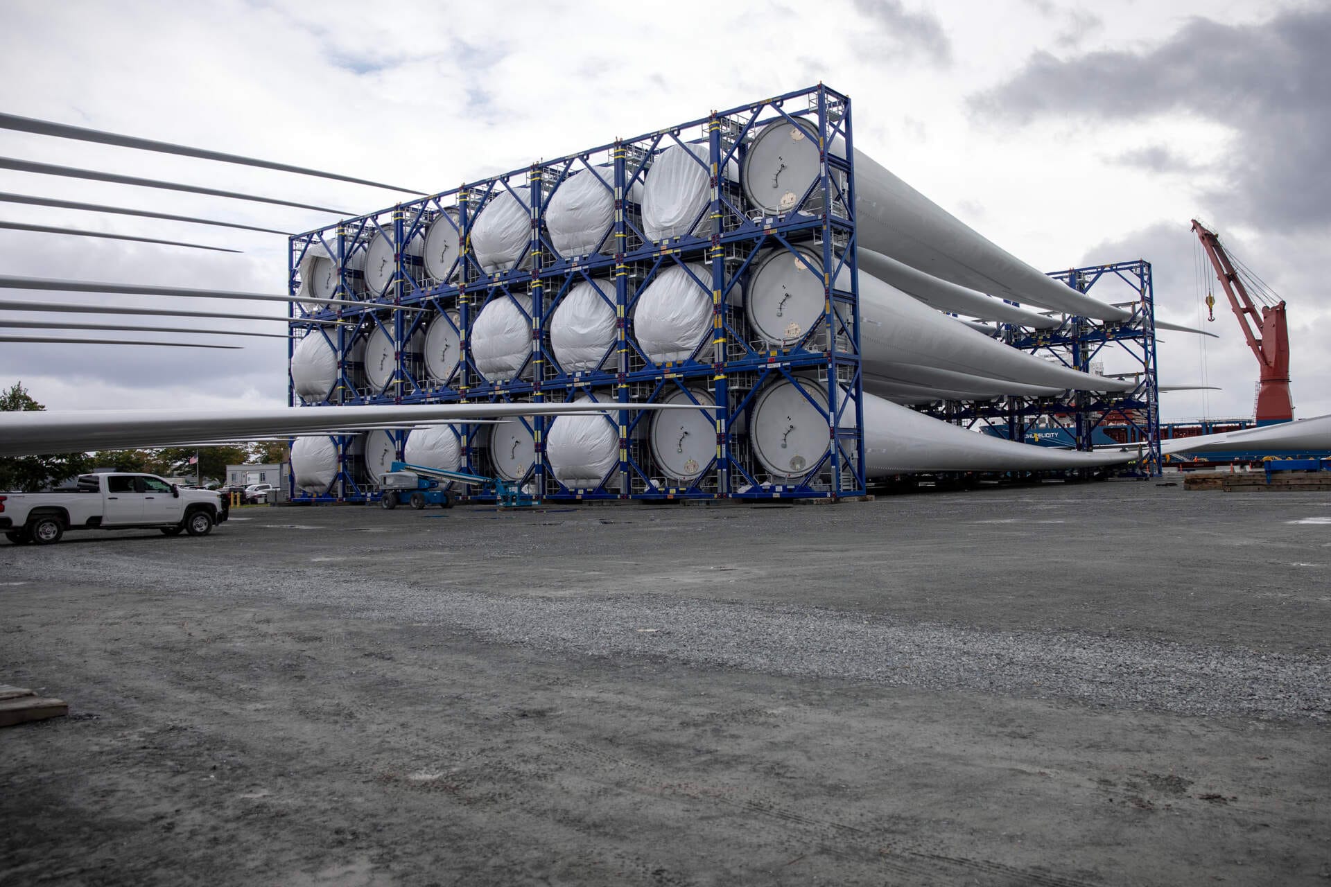 Cuando las palas llegan al Terminal Marítimo de Comercio en New Bedford, se organizan en pilas de tres — un conjunto completo para cada turbina. Las palas están hechas de un material compuesto, y cada una tiene aproximadamente la longitud de un campo de fútbol. Juntas, las tres palas pesan alrededor de 192 toneladas.