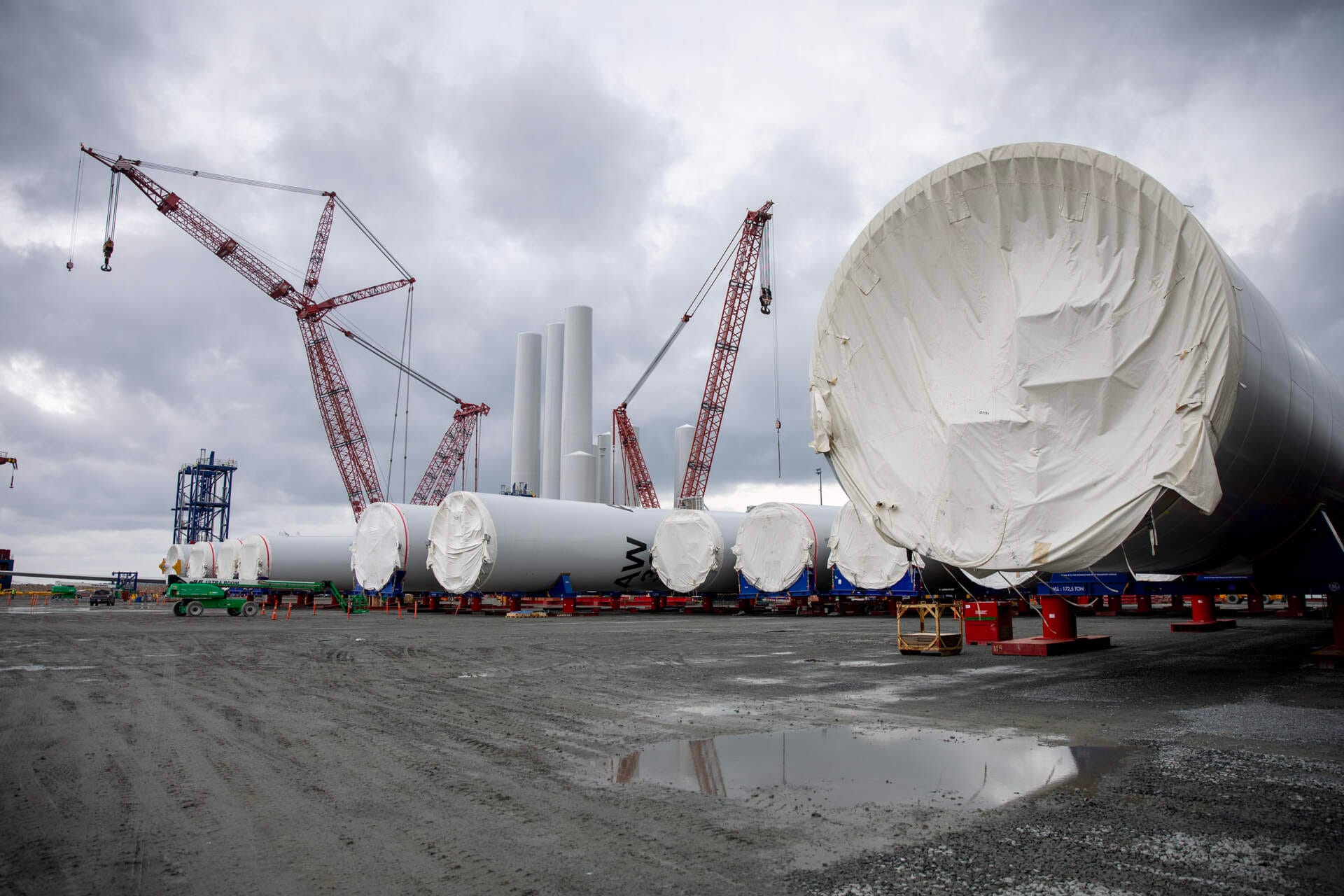 A principios de este año, WBUR visitó el sitio en Cape Cod donde llegarán a tierra los cables del proyecto y se conectarán a la red eléctrica. Recientemente, realizamos otro viaje para ver el área de preparación en tierra en el Terminal Marítimo de Comercio en New Bedford. Este puerto diseñado especialmente es donde se almacenan y ensamblan parcialmente las grandes partes de la turbina antes de ser transportadas al mar.