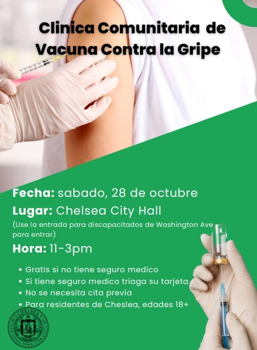 Este sábado 28 de octubre, la Ciudad de Chelsea organizará una clínica comunitaria contra la gripe en el City Hall de 11:00 am a 3:00 pm.