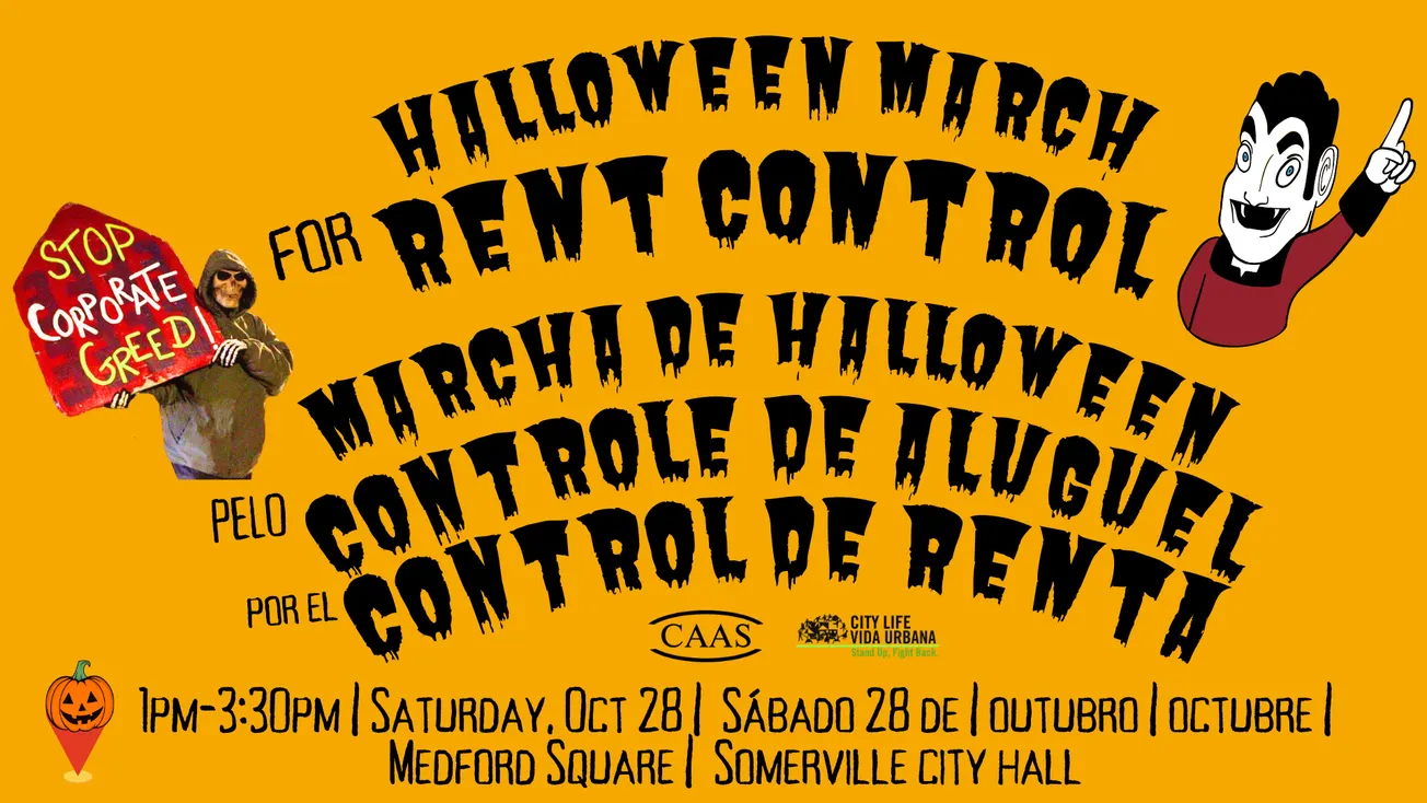 El sábado 28 de octubre, miembros de la comunidad de Medford y Somerville marcharán más de 3 millas desde Medford Square hasta el Ayuntamiento de Somerville para exigir a los representantes estatales y senadores que tomen medidas inmediatas para aprobar los proyectos de ley de estabilización de alquileres S.1299 / H.2103. Según un comunicado emitido por Agencia de Acción Comunitaria de Somerville (CAAS) , City Life/Vida Urbana (CLVU), Somerville Community Land Trust , Bradlee Road Tenant Association de Medford, partidarios y aliados de las comunidades circundantes de Medford y Somerville.