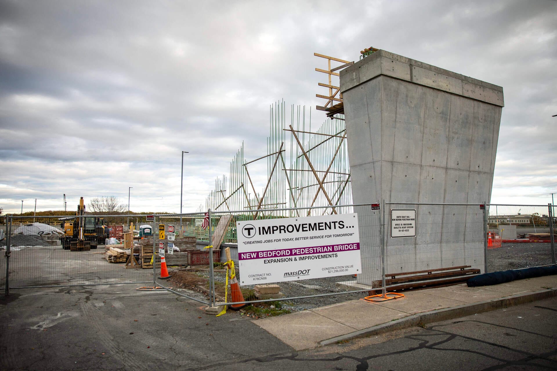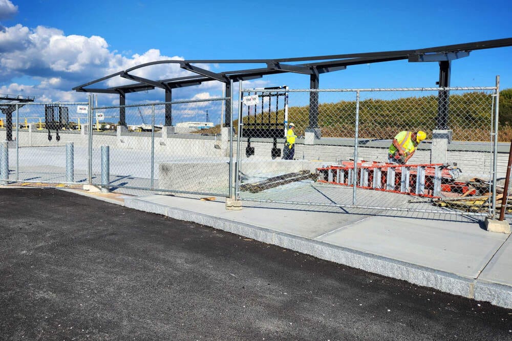 En una visita reciente, los contratistas vestidos con chalecos de neón trabajaron en la plataforma de concreto blanco de la futura estación de New Bedford. Las vigas que eventualmente sostendrán un techo sobresalen como ramitas.