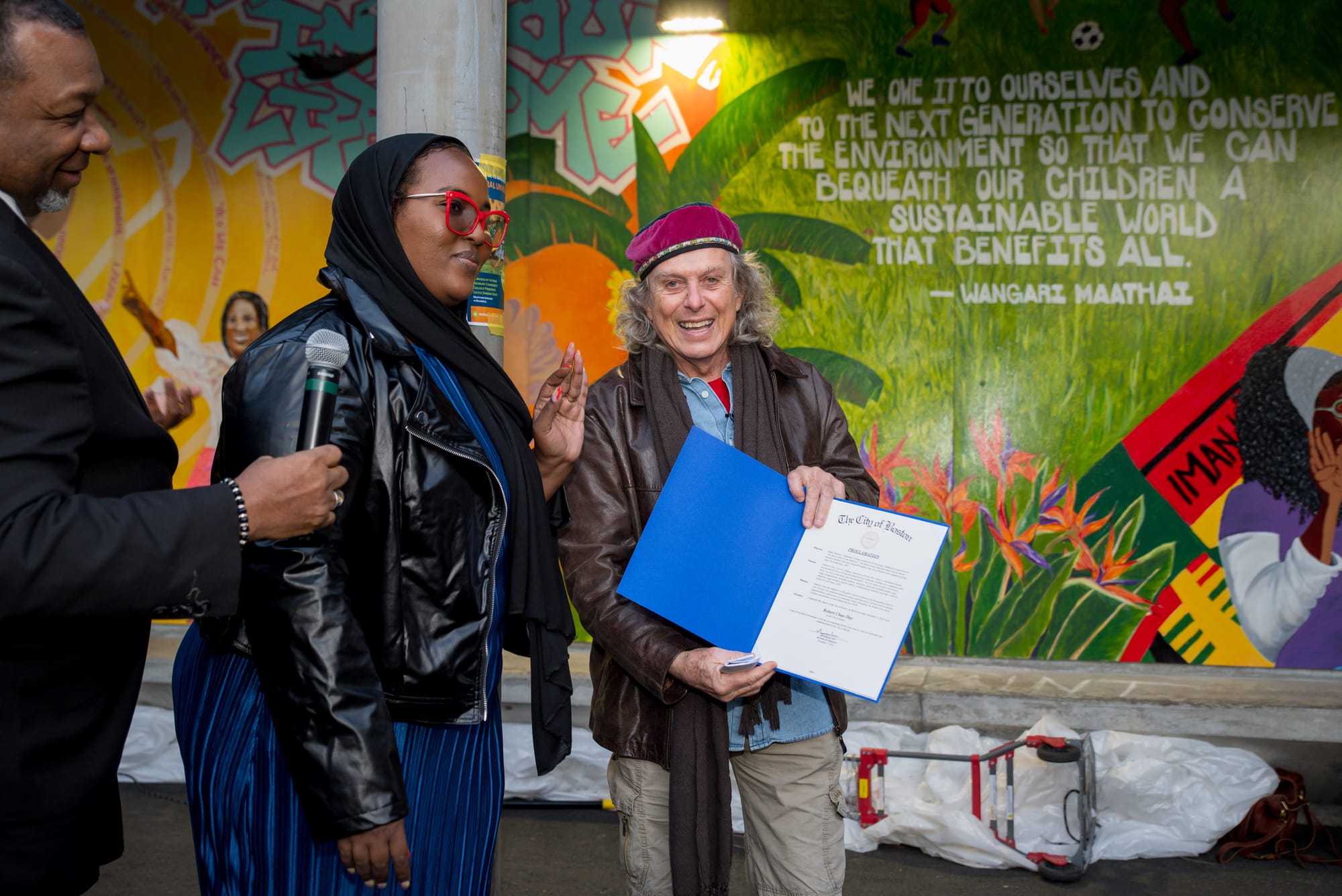 Jackie Jenkins-Scott, Presidenta Interina del Roxbury Community College, expresó con emoción: «Este mural es un testimonio del compromiso del colegio en la celebración de historias diversas, el fomento del talento local y la promoción de alianzas comunitarias»