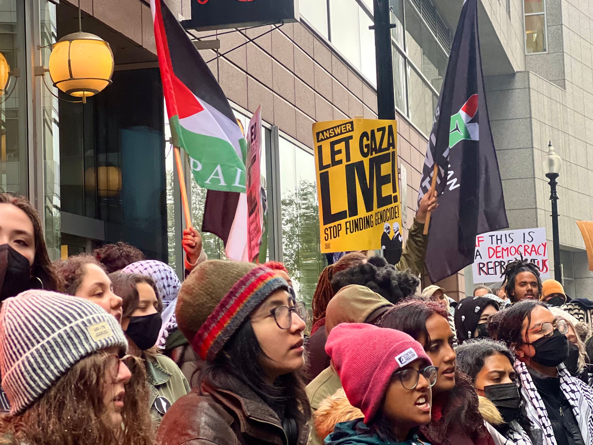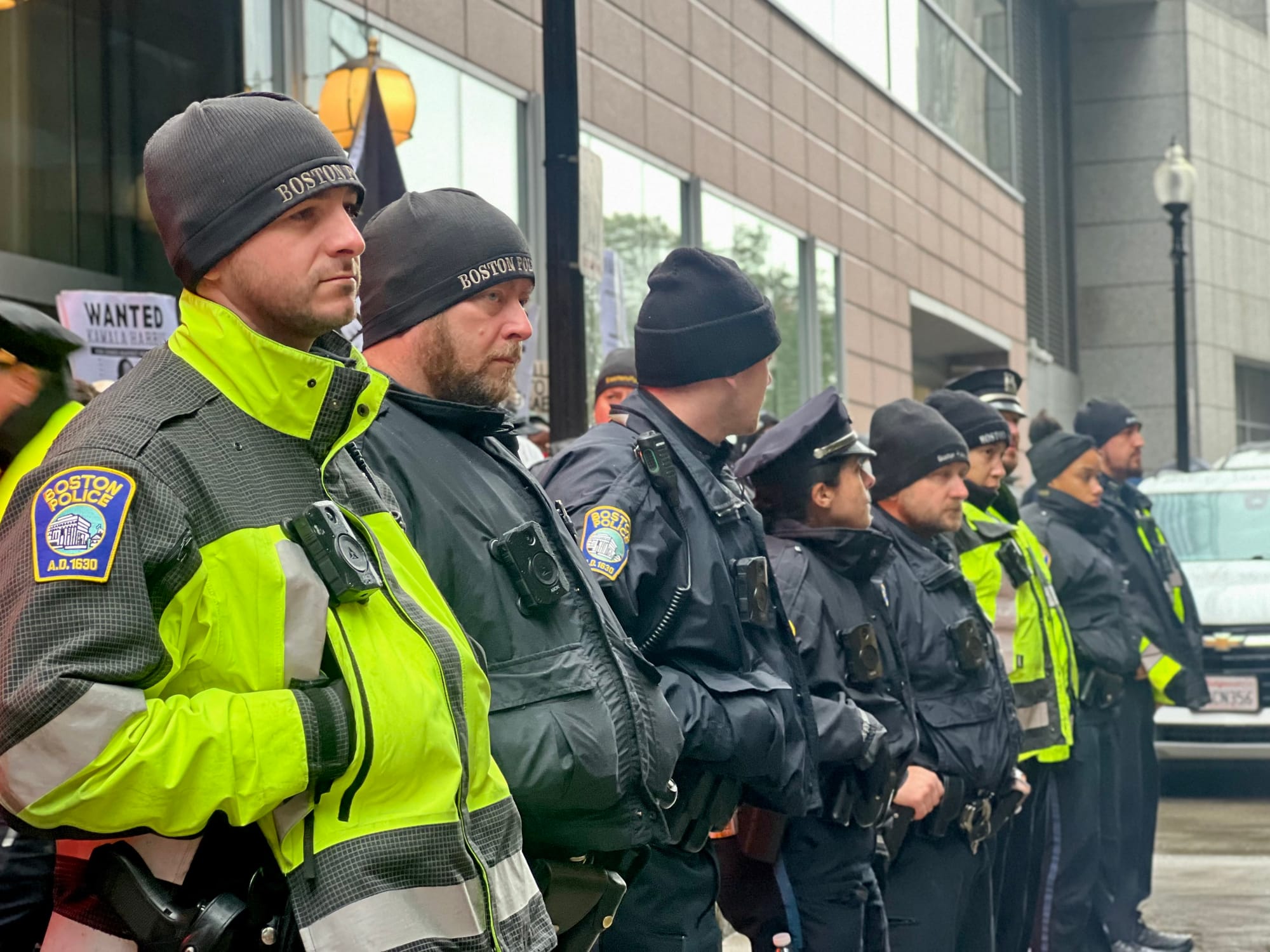 La llegada de la vicepresidenta a Boston reunió a protestantes en el hotel The Ritz- Carlton sosteniendo pancartas y banderas apoyando a los palestinos, a los israelíes y a ambos. También, habían policías con perros rebuscando vehículos, conllevando arrestos, manejando el tráfico y parando a cada persona que pasará por los predios para asegurarse de que no hubieran armas presentes.