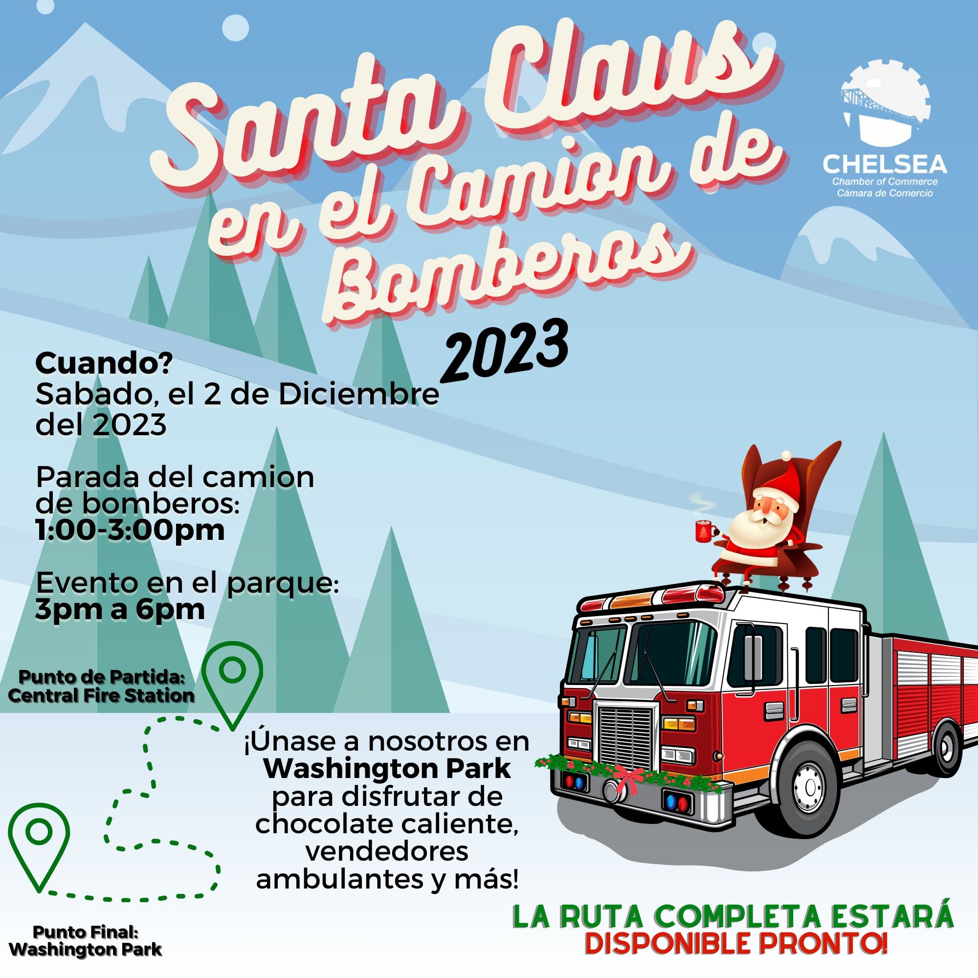Santa visitará Chelsea el sábado 2 de diciembre de 1:00 a 3:00pm. Comenzará en la Estación Central de Bomberos y terminará en Washington Park.