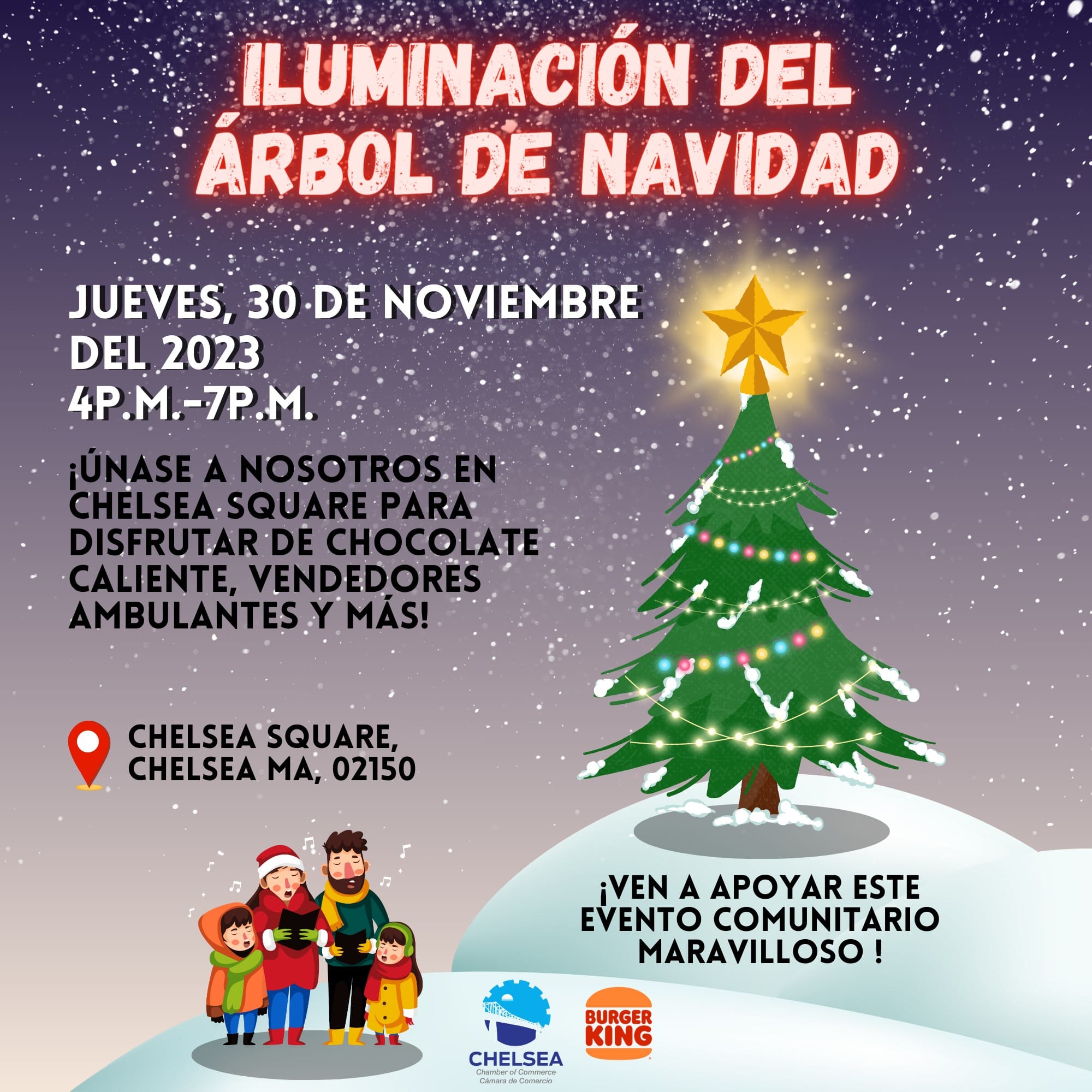El jueves 30 de noviembre de 4:00 a 7:00 p.m. en Chelsea Square será la iluminación anual del árbol navideño. Habrá un rico chocolate caliente, villancicos, vendedores y más.